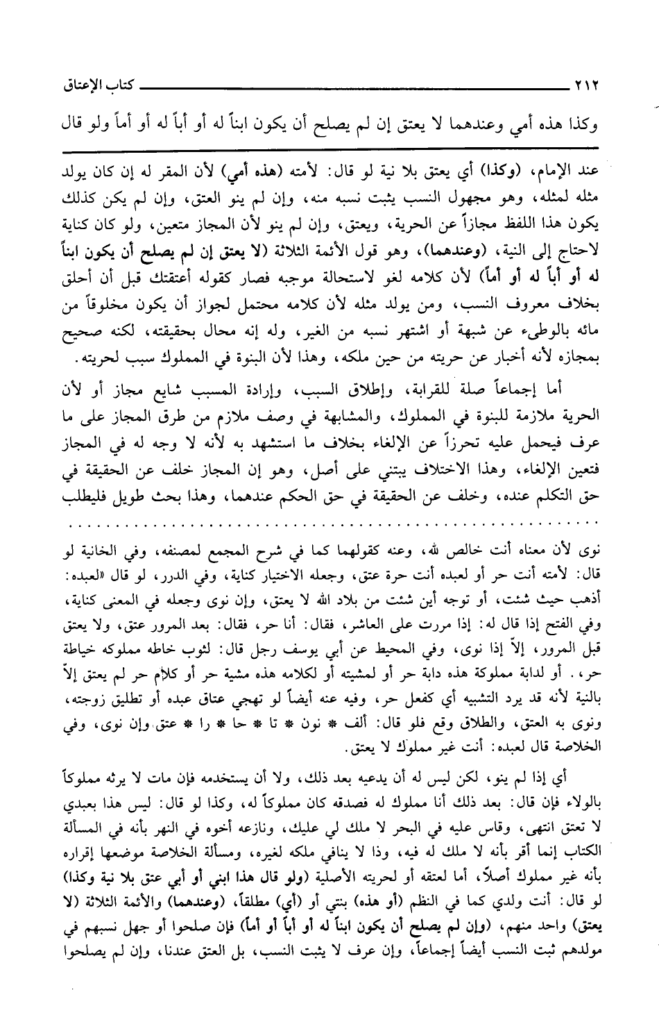 ولو قال للأصغر أو الأكبر سنا هذا ابني أو أبي عتق بلا نية عند الإمام وكذا أي يعتق بلا نية لو قال لأمته هذه أمي لأن المقر له إن كان يولد مثله وهو مجهول النسب يثبت نسبه منه وإن لم ينو العتق وإن لم يكن كذلك يكون هذا اللفظ مجازا عن الحرية ويعتق وإن لم ينو لأن المجاز متعين ولو كان كناية لاحتاج إلى النية وعندهما وهو قول الأئمة الثلاثة لا يعتق إن لم يصلح أن يكون ابنا له أو أبا له أو أما لأن كلامه لغو لاستحالة موجبه فصار كقوله أعتقتك قبل أن أحلق بخلاف معروف النسب ومن يولد له مثله لأن كلامه محتمل لجواز أن يكون مخلوقا من مائه بالوطء عن شبهة أو اشتهر نسبه من الغير وله أنه محال بحقيقته لكنه صحيح بمجازه لأنه إخبار عن حريته من حين ملكه وهذا لأن البنوة في المملوك سبب لحريته إما إجماعا صلة للقرابة وإطلاق السبب وإرادة المسبب شائع مجازا ولأن الحرية ملازمة للبنوة في المملوك والمشابهة في وصف ملازم من طرق المجاز على ما عرف فيحمل عليه تحرزا عن الإلغاء بخلاف ما استشهد به لأنه لا وجه له في المجاز فتعين الإلغاء وهذا الاختلاف يبتنى على أصل وهو أن المجاز خلف عن الحقيقة في حق التكلم عنده وخلف عن الحقيقة في حق الحكم عندهما وهذا بحث طويل فليطلب