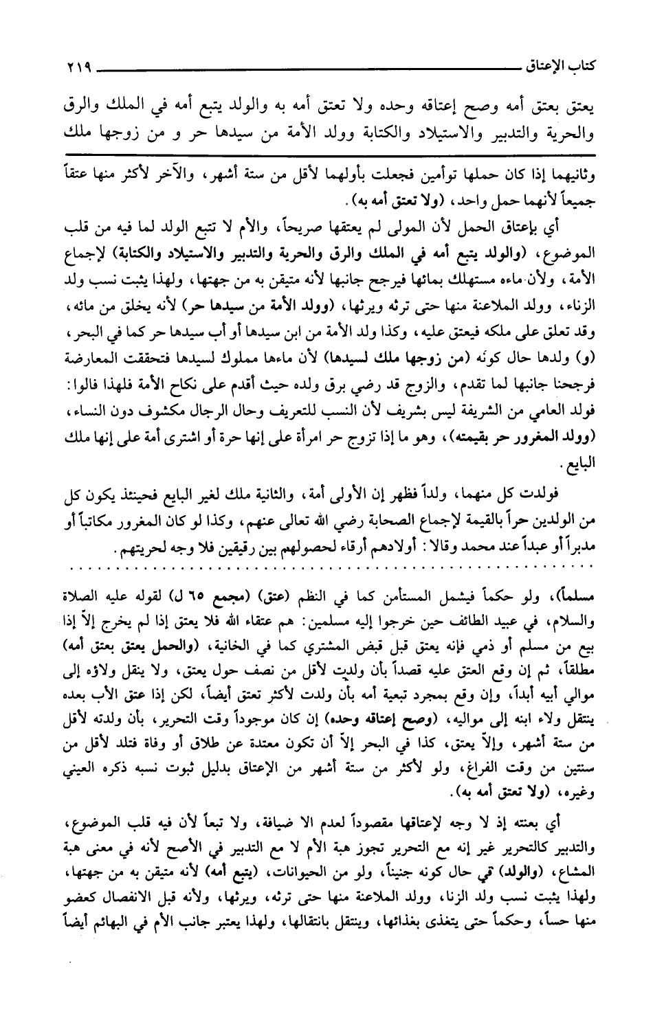 وثانيهما إذا كان حملها توأمين فجعلت بأولهما لأقل من ستة أشهر والآخر لأكثر منها عتقا جميعا لأنهما حمل واحد ولا تعتق أمه به أي بإعتاق الحمل لأن المولى لم يعتقها صريحا والأم لا تتبع الولد لما فيه من قلب الموضوع والولد يتبع أمه في الملك والرق والحرية والتدبير والاستيلاد والكتابة لإجماع الأمة ولأن ماءه مستهلك بمائها فيرجح جانبها لأنه متيقن به من جهتها وهذا يثبت نسب ولد الزنا وولد الملاعنة منها حتى ترثه ويرثها وولد الأمة من سيدها حر لأنه يخلق من مائه وقد تعلق على ملكه فيعتق عليه وكذا ولد الأمة من ابن سيدها أو أب سيدها حر كما في البحر و ولدها حال كونه من زوجها ملك لسيدها لأن ماءها مملوك لسيدها فتحققت المعارضة فرجحنا جانبها لما تقدم والزوج قد رضي برق ولده حيث أقدم على نكاح الأمة فلهذا قالوا فولد العامي من الشريفة ليس بشريف لأن النسب للتعريف وحال الرجال مكشوف دون النساء وولد المغرور حر بقيمته وهو ما إذا تزوج حر امرأة على أنها حرة أو اشترى أمة على أنها ملك البائع فولدت كل منهما ولدا فظهر أن الأولى أمة والثانية ملك لغير البائع فحينئذ يكون كل من الولدين حرا بالقيمة لإجماع الصحابة رضي الله تعالى عنهم وكذا لو كان المغرور مكاتبا أو مدبرا أو عبدا عند محمد وقالا أولادهم أرقاء لحصولهم بين رقيقين فلا وجه لحريتهم
