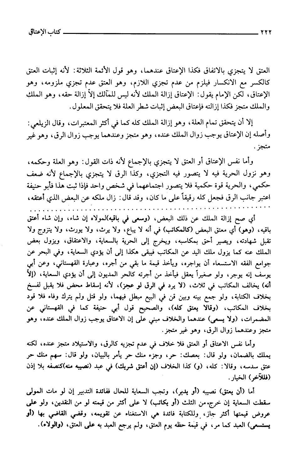 وقال الزيلعي وأصله أن الإعتاق يوجب زوال الملك عنده وهو متجزئ وعندهما يوجب زوال الرق وهو غير متجزئ وأما نفس الإعتاق أو العتق لا يتجزأ بالإجماع لأنه ذات القول وهو العلة وحكمه وهو نزول الحرية فيه لا يتصور فيه التجزؤ وكذا الرق لا يتجزأ بالإجماع لأنه ضعف حكمي والحرية قوة حكمية فلا يتصور اجتماعهما في شخص واحد فإذا ثبت هذا فأبو حنيفة اعتبر جانب الرق فجعل كله رقيقا على ما كان وقد قال زال ملكه عن البعض الذي أعتقه
