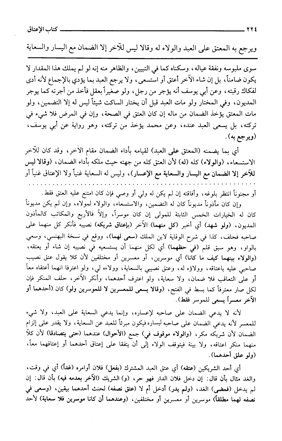 سوى ملبوسه ونفقة عياله وسكناه كما في التبيين والظاهر منه أنه لو لم يملك هذا المقدار لا يكون ضامنا بل إن شاء الآخر أعتق أو استسعى ولا يرجع العبد بما يؤدي بالإجماع لأنه أدى لفكاك رقبته