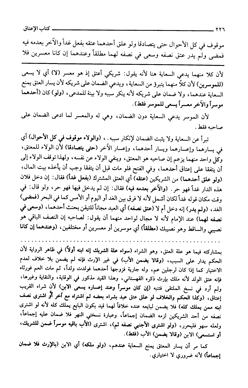 وفي الفتح فلو مات قبل أن يتفقا وجب أن يأخذه بيت المال ولو علق أحدهما من الشريكين عتقه أي العتق المشترك بفعل غدا فقال إن دخل فلان هذه الدار غدا فهو حر والآخر بعدمه فيه فقال إن لم يدخل فيها فهو حر ولو قال في وقت مكان قوله غدا لكان أشمل لأنه لا فرق بين الغد أو اليوم أو الأمس كما في البحر فمضى الغد ولم يدر أنه دخل أم لا عتق نصفه أي العبد مجانا للتيقن بحنث أحدهما وسعى في نصفه لهما عند الإمام لأنه لا مجال لواحد منهما أن يقول لصاحبه إن النصف الباقي هو نصيبي والساقط هو نصيبك مطلقا أي موسرين أو معسرين أو مختلفين وعندهما إن كانا