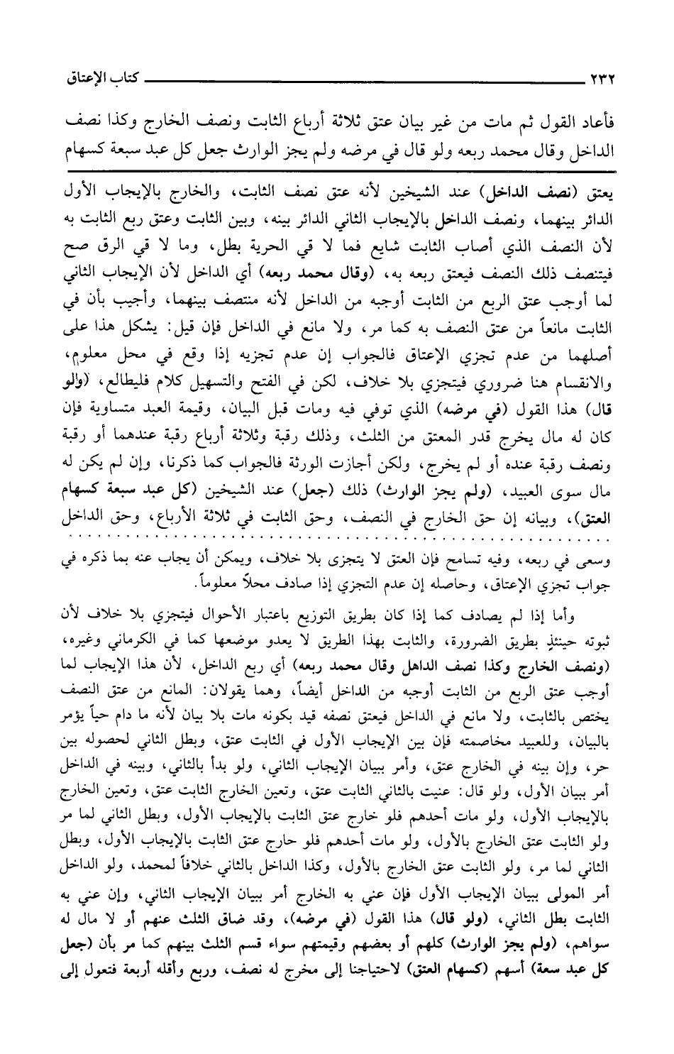 يعتق نصف الداخل عند الشيخين لأنه عتق نصف الثابت والخارج بالإيجاب الأول الدائر بينهما ونصف الداخل بالإيجاب الثاني الدائر بينه وبين الثابت وعتق ربع الثابت به لأن النصف الذي أصاب الثابت شائع فما لاقى الحرية بطل وما لاقى الرق صح فيتنصف ذلك النصف فيعتق ربعه به وقال محمد ربعه أي الداخل لأن الإيجاب الثاني لما أوجب عتق الربع من الثابت أوجبه من الداخل لأنه متنصف بينهما وأجيب بأن في الثابت مانعا من عتق النصف به كما مر ولا مانع في الداخل فإن قيل يشكل هذا على أصلهما من عدم تجزؤ الإعتاق فالجواب أن عدم تجزئه إذا وقع في محل معلوم والانقسام هنا ضروري فيتجزأ بلا خلاف لكن في الفتح والتسهيل كلام فليطالع