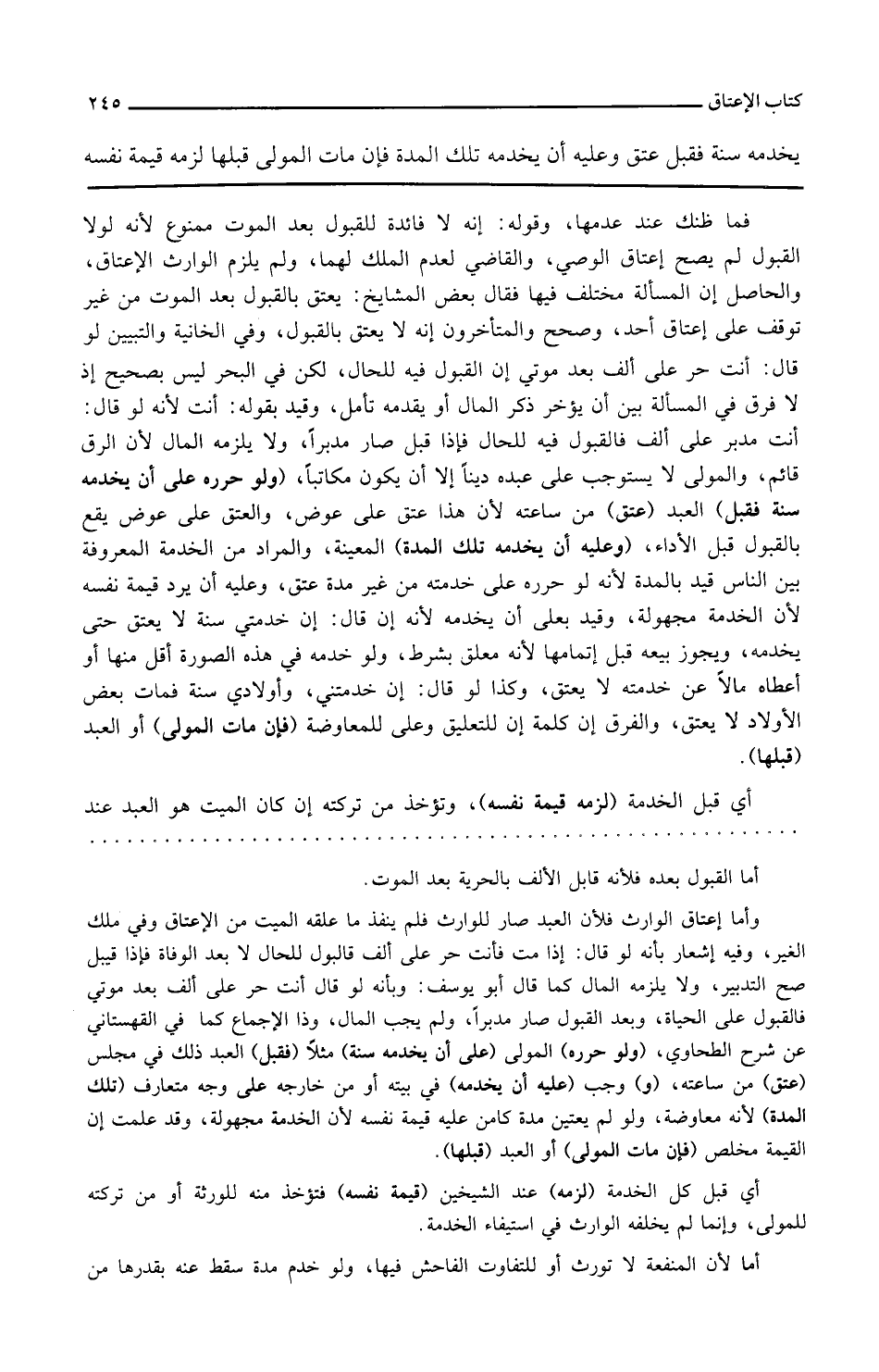 ولو حرره على أن يخدمه سنة فقبل العبد عتق من ساعته لأن هذا عتق على عوض والعتق على عوض يقع بالقبول قبل الأداء وعليه أن يخدمه تلك المدة المعينة والمراد من الخدمة الخدمة المعروفة بين الناس قيد بالمدة لأنه لو حرره على خدمته من غير مدة عتق وعليه أن يرد قيمة نفسه لأن الخدمة مجهولة وقيد بعلى أن يخدمه لأنه إن قال إن خدمتني سنة لا يعتق حتى يخدمه ويجوز بيعه قبل إتمامها لأنه معلق بشرط ولو خدمه في هذه الصورة أقل منها أو أعطاه مالا عن خدمته لا يعتق وكذا لو قال إن خدمتني وأولادي سنة فمات بعض الأولاد لا يعتق والفرق أن كلمة إن للتعليق وعلى للمعاوضة فإن مات المولى أو العبد قبلها أي قبل الخدمة لزمه قيمة نفسه وتؤخذ من تركته إن كان الميت هو العبد عند