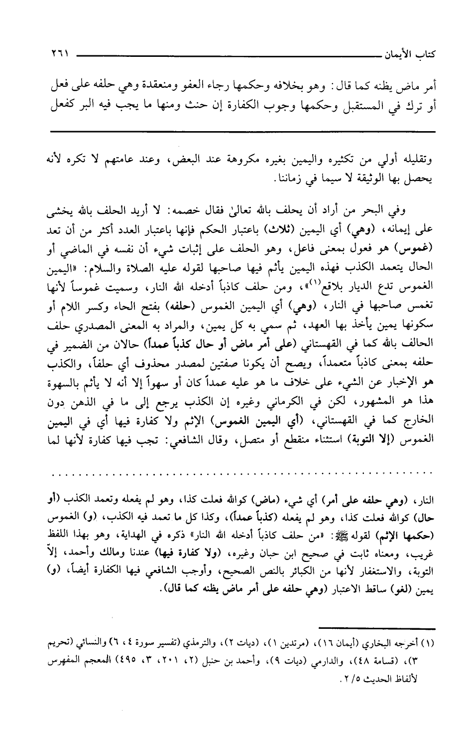 وهي أي اليمين ثلاث باعتبار الحكم فإنها باعتبار العدد أكثر من أن تعد غموس هو فعول بمعنى فاعل وهو الحلف على إثبات شيء أو نفيه في الماضي أو الحال يتعمد الكذب فهذه اليمين يأثم فيها صاحبها لقوله عليه الصلاة والسلام اليمين الغموس تدع الديار بلاقع ومن حلف كاذبا أدخله الله النار وسميت غموسا لأنها تغمس صاحبها في النار وهي أي اليمين الغموس حلفه بفتح الحاء وكسر اللام أو سكونها يمين يؤخذ بها العهد ثم سمي به كل يمين والمراد به المعنى المصدري حلف الحالف بالله كما في القهستاني على أمر ماض أو حال كذبا عمدا حالان من الضمير في حلف بمعنى كاذبا متعمدا ويصح أن يكون صفتين لمصدر محذوف أي حلفا والكذب هو الإخبار عن الشيء على خلاف ما هو عليه عمدا كان أو سهوا إلا أنه لا يأثم بالسهو هذا هو المشهور لكن في الكرماني وغيره أن الكذب يرجع إلى ما في الذهن دون الخارج كما في القهستاني وحكمها أي اليمين الغموس الإثم ولا كفارة فيها أي في اليمين الغموس إلا التوبة استثناء منقطع أو متصل