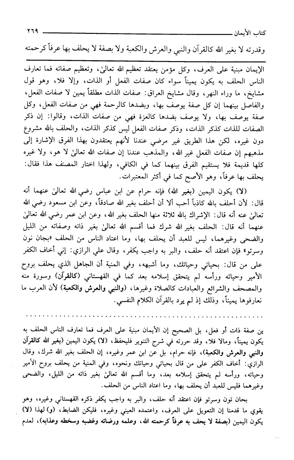 وقال مشايخ العراق صفات الذات مطلقا يمين لا صفات الفعل والفاصل بينهما أن كل صفة يوصف بها وبضدها كالرحمة فهي من صفات الفعل وكل صفة يوصف بها ولا يوصف بضدها كالعزة فهي من صفات الذات وقالوا إن ذكر الصفات للذات كذكر الذات وذكر صفات الفعل ليس كذكر الذات والحلف بالله مشروع دون غيره لكن هذا الطريق غير مرضي عندنا لأنهم يعتقدون بهذا الفرق الإشارة إلى مذهبهم أن صفات الفعل غير الله والمذهب عندنا أن صفات الله تعالى لا هو ولا غيره كلها قديمة فلا يستقيم الفرق بينهما كما في الكافي ولهذا اختار المصنف هذا فقال يحلف بها عرفا وهو الأصح كما في أكثر المعتبرات لا يكون اليمين بغير الله فإنه حرام عن ابن عباس رضي الله تعالى عنهما أنه قال لأن أحلف بالله كاذبا أحب إلي من أن أحلف بغير الله صادقا وعن ابن مسعود رضي الله تعالى عنه أنه قال الإشراك بالله ثلاثة منها الحلف بغير الله وعن ابن عمر رضي الله تعالى عنهما أنه قال الحلف بغير الله شرك فما أقسم الله تعالى بغير ذاته وصفاته من الليل والضحى وغيرهما ليس للعبد أن يحلف بها وما اعتاد الناس من الحلف بجان نون وسرتو فإن اعتقد أنه حلف والبر به واجب يكفر