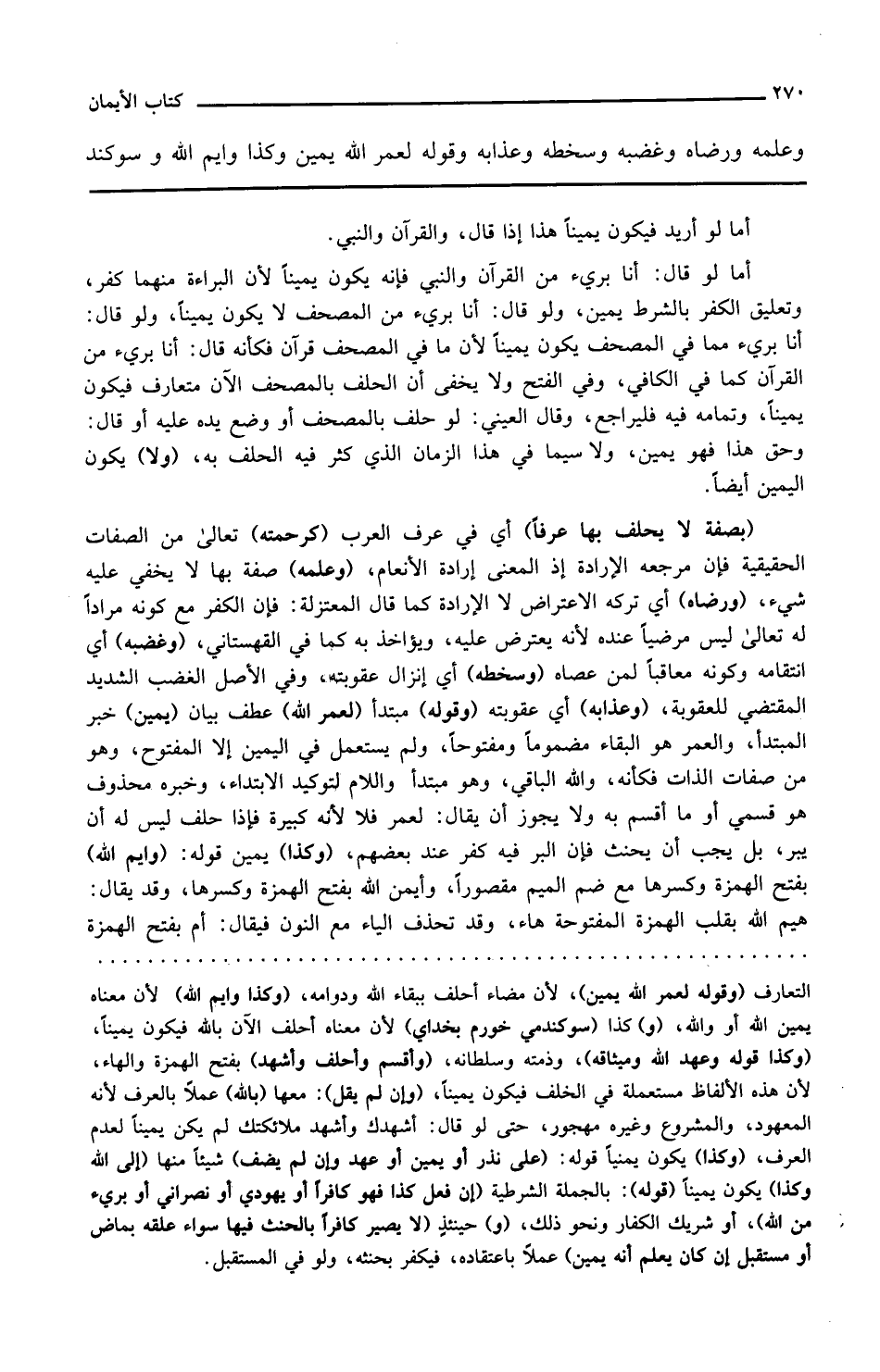 وقال العيني لو حلف بالمصحف أو وضع يده عليه أو قال وحق هذا فهو يمين ولا سيما في هذا الزمان الذي كثر فيه الحلف به ولا يكون اليمين أيضا بصفة لا يحلف بها عرفا أي في عرف العرب كرحمته تعالى من الصفات الحقيقية فإن مرجعه الإرادة إذ المعنى إرادة الإنعام وعلمه صفة بها لا يخفى عليه شيء ورضاه أي تركه الاعتراض لا الإرادة كما قال المعتزلة فإن الكفر مع كونه مرادا له تعالى ليس مرضيا عنده لأنه يعترض عليه ويؤاخذ به كما في القهستاني وغضبه أي انتقامه وكونه معاقبا لمن عصاه وسخطه أي إنزال عقوبته وفي الأصل الغضب الشديد المقتضي للعقوبة وعذابه أي عقوبته وقوله مبتدأ لعمر الله عطف بيان يمين خبر المبتدأ والعمر هو البقاء مضموما ومفتوحا ولم يستعمل في اليمين إلا المفتوح وهو من صفات الذات فكأنه قال والله الباقي وهو مبتدأ واللام لتوكيد الابتداء وخبره محذوف هو قسمي أو ما أقسم به ولا يجوز أن يقال لعمر فلا لأنه كبيرة فإذا حلف ليس له أن يبر بل يجب أن يحنث فإن البر فيه كفر عند بعضهم