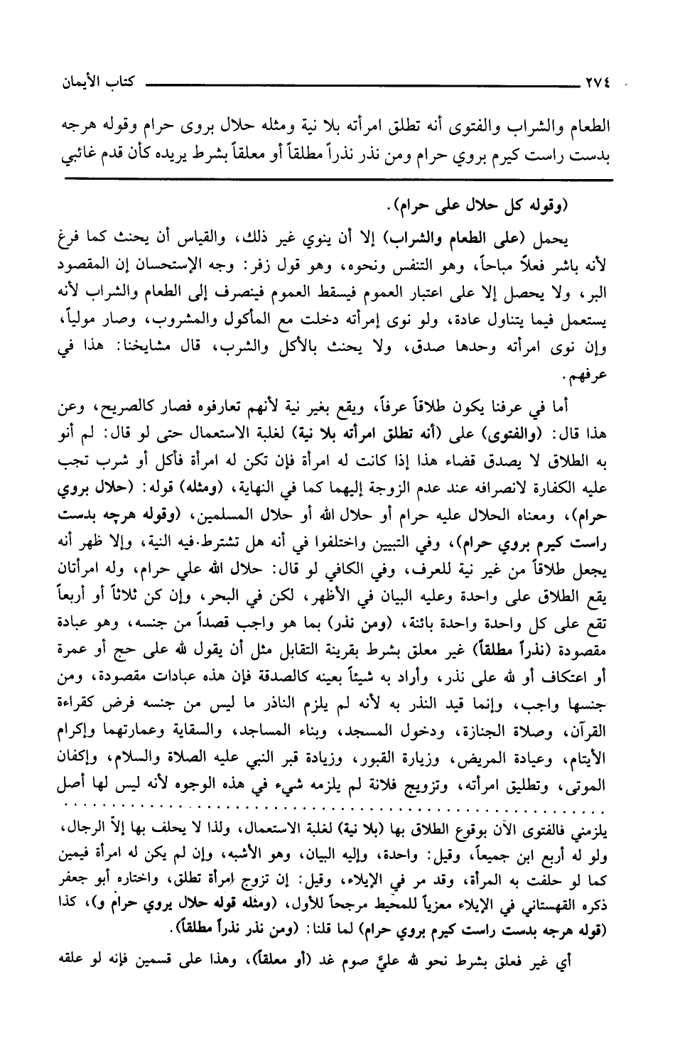 وقوله كل حلال علي حرام يحمل على الطعام والشراب إلا أن ينوي غير ذلك والقياس أن يحنث كما فرغ لأنه باشر فعلا مباحا وهو التنفس ونحوه وهو قول زفر وجه الاستحسان أن المقصود البر ولا يحصل إلا على اعتبار العموم فيسقط العموم فينصرف إلى الطعام والشراب لأنه يستعمل فيما يتناول عادة ولو نوى امرأته دخلت مع المأكول والمشروب وصار موليا وإن نوى امرأته وحدها صدق ولا يحنث بالأكل والشرب قال مشايخنا هذا في عرفهم أما في عرفنا يكون طلاقا عرفا ويقع بغير نية لأنهم تعارفوه فصار كالصريح وعن هذا قال والفتوى على أنه تطلق امرأته بلا نية لغلبة الاستعمال حتى لو قال لم أنو به الطلاق لا يصدق قضاء هذا إذا كانت له امرأة فإن تكن له امرأة فأكل أو شرب تجب عليه الكفارة لانصرافه عند عدم الزوجة إليهما كما في النهاية ومثله قوله حلال بروى حرام ومعناه الحلال عليه حرام أو حلال الله أو حلال المسلمين وقوله هرجه بدست راست كيرم بروي حرام