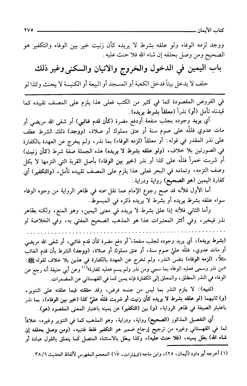 والتكفير أي كفارة اليمين هو الصحيح رواية ودراية أما الأول فلأنه قد صح رجوع الإمام عما نقل عنه في ظاهر الرواية من وجوه الوفاء سواء علقه بشرط يريده أو بشرط لا يريده ذكره في المبسوط وأما الثاني فلأنه إذا علق بشرط لا يريده ففي معنى اليمين وهو المنع ولكنه بظاهره نذر فيخير وفي أكثر المعتبرات هذا هو المذهب الصحيح المفتى به وفي الخلاصة لو
