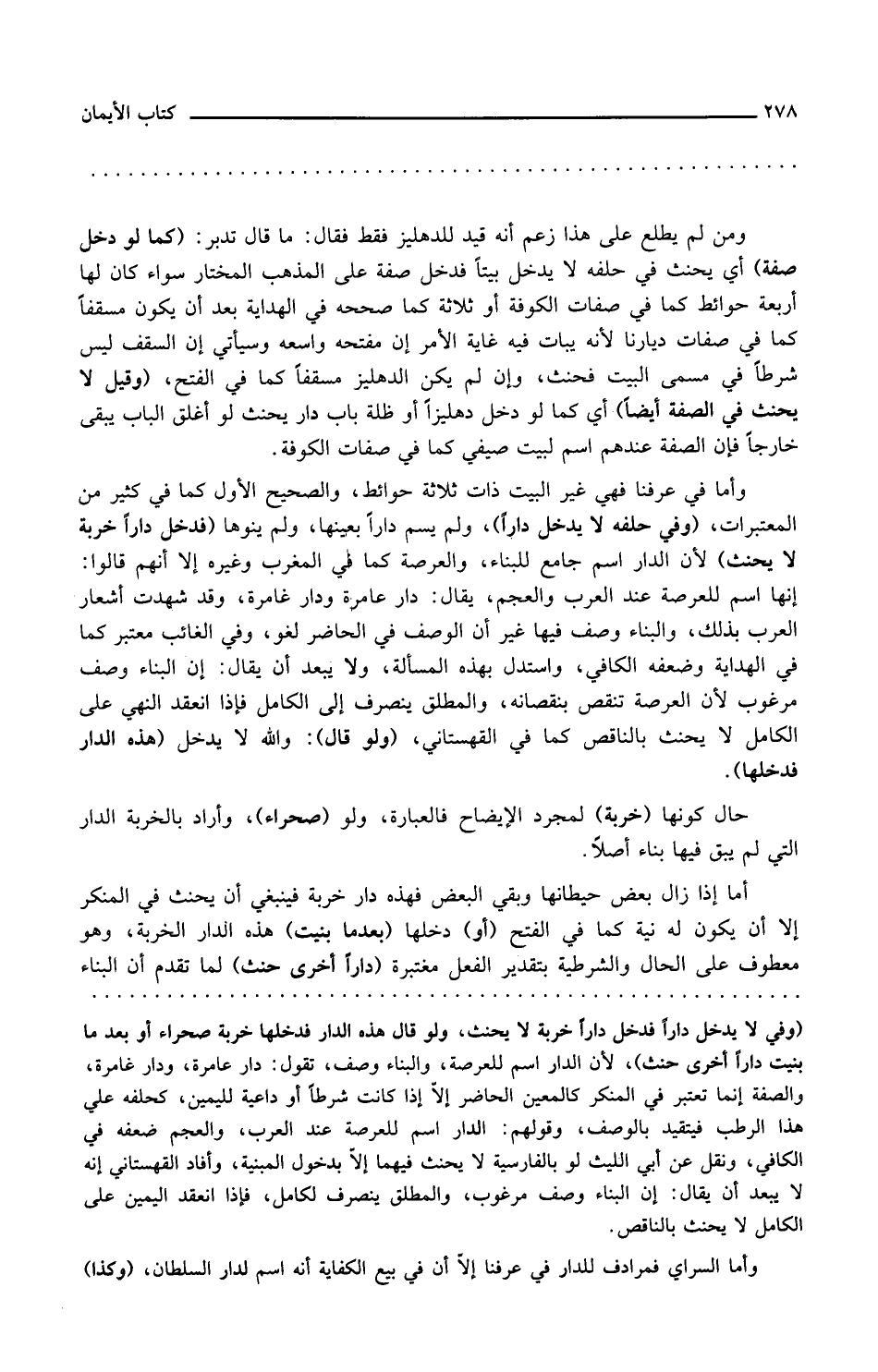 ومن لم يطلع على هذا زعم أنه قيد للدهليز فقط فقال ما قال تدبر كما لو دخل صفة أي يحنث في حلفه لا يدخل بيتا فدخل صفة على المذهب المختار سواء كان لها أربعة حوائط كما في صفات الكوفة أو ثلاثة كما صححه في الهداية بعد أن يكون مسقفا كما في صفات ديارنا لأنه يبات فيه غاية الأمر أن مفتحه واسع وسيأتي أن السقف ليس شرطا في مسمى البيت فيحنث وإن لم يكن الدهليز مسقفا كما في الفتح وقيل لا يحنث في الصفة أيضا أي كما لو دخل دهليزا أو ظلة باب دار بحيث لو أغلق الباب يبقى خارجا فإن الصفة عندهم اسم لبيت صيفي كما في صفات الكوفة وأما في عرفنا فهي غير البيت ذات ثلاثة حوائط والصحيح الأول كما في كثير من المعتبرات وفي حلفه لا يدخل دارا ولم يسم دارا بعينها ولم ينوها فدخل دارا خربة لا يحنث لأن الدار اسم جامع للبناء والعرصة كما في المغرب وغيره إلا أنهم قالوا أنها اسم للعرصة عند العرب والعجم يقال دار عامرة ودار غامرة وقد شهدت أشعار العرب بذلك والبناء وصف فيها غير أن الوصف في الحاضر لغو وفي الغائب معتبر كما في الهداية وضعفه الكافي واستدل بهذه المسألة ولا يبعد أن يقال إن البناء وصف مرغوب لأن العرصة تنقص بنقصانه والمطلق ينصرف إلى الكامل فإذا انعقد النهي على الكامل لا يحنث بالناقص كما في القهستاني