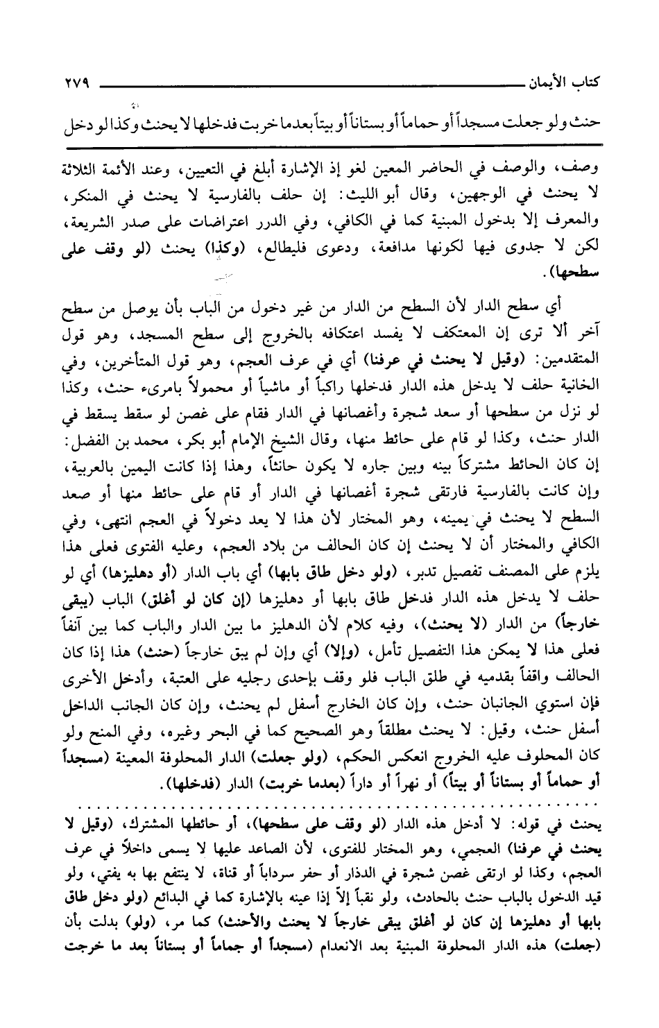وقال الشيخ الإمام أبو بكر محمد بن الفضل إن كان الحائط مشتركا بينه وبين جاره لا يكون حانثا وهذا إذا كانت اليمين بالعربية وإن كانت بالفارسية فارتقى شجرة أغصانها في الدار أو قام على حائط منها أو صعد السطح لا يحنث في يمينه وهو المختار لأن هذا لا يعد دخولا في العجم انتهى