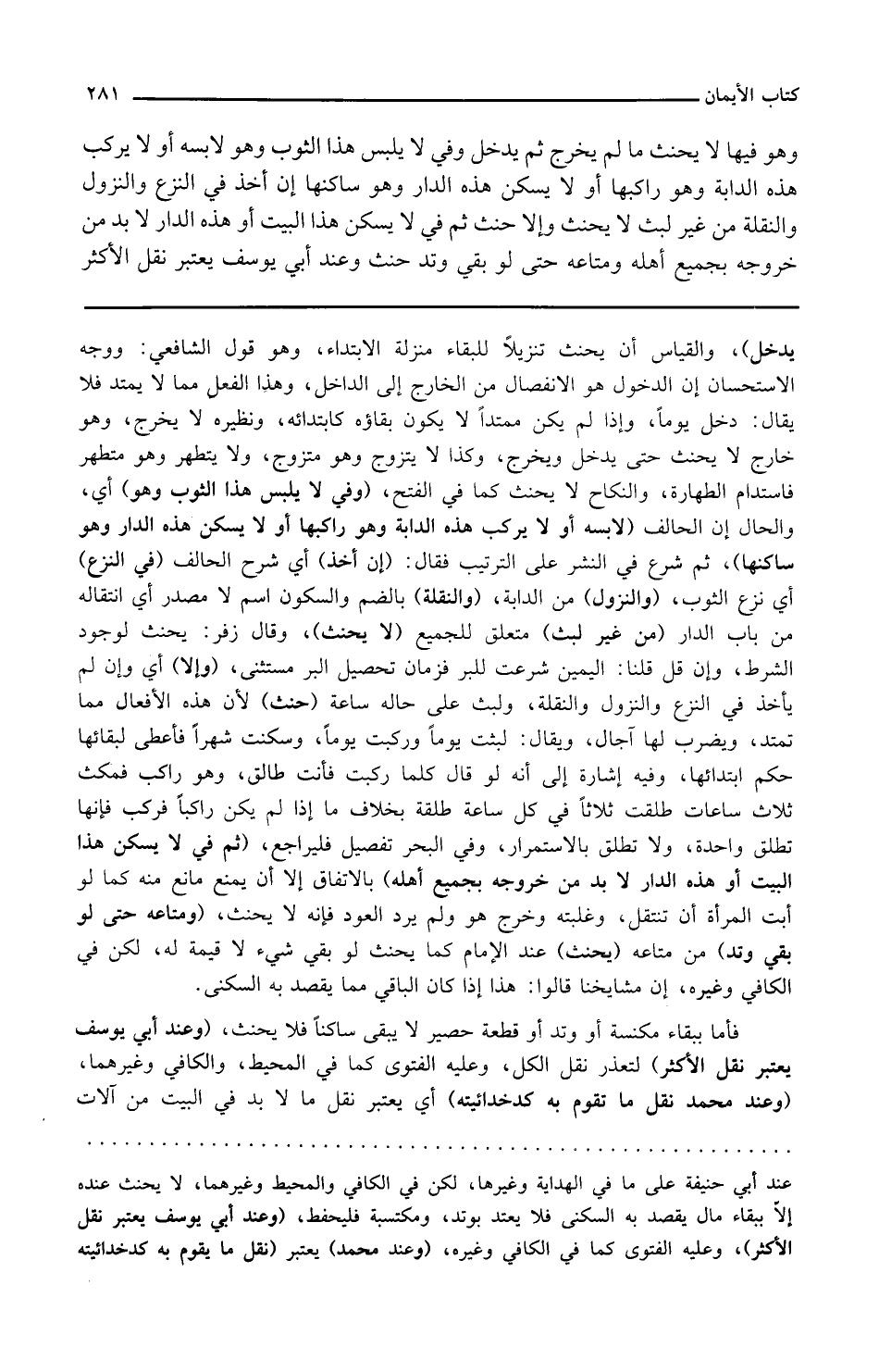 وفي البحر تفصيل فليراجع ثم في لا يسكن هذا البيت أو هذه الدار لا بد من خروجه بجميع أهله بالاتفاق إلا أن يمنع مانع منه كما لو أبت المرأة أن تنتقل وغلبته وخرج هو ولم يرد العود فإنه لا يحنث ومتاعه حتى لو بقي وتد من متاعه يحنث عند الإمام كما يحنث لو بقي شيء لا قيمة له لكن في الكافي وغيره أن مشايخنا قالوا هذا إذا كان الباقي مما يقصد به السكنى فأما ببقاء مكنسة أو وتد أو قطعة حصير لا يبقى ساكنا فلا يحنث وعند أبي يوسف يعتبر نقل الأكثر لتعذر نقل الكل وعليه الفتوى كما في المحيط والكافي وغيرهما وعند محمد نقل ما يقوم به كدخدائيته أي يعتبر نقل ما لا بد في البيت من آلات