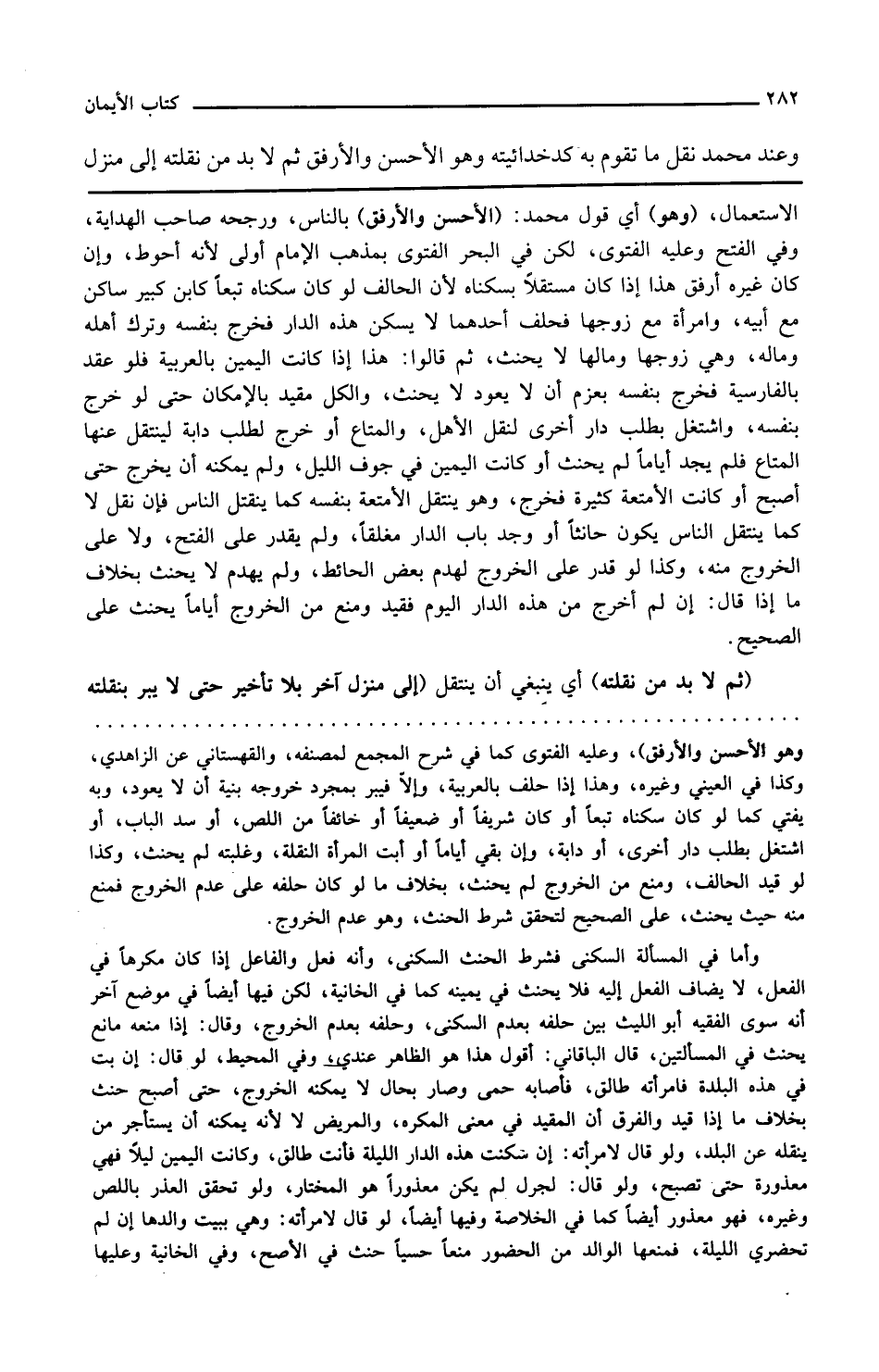 وفي الفتح وعليه الفتوى لكن في البحر الفتوى بمذهب الإمام أولى لأنه أحوط وإن كان غيره أرفق هذا إذا كان مستقلا بسكناه لأن الحالف لو كان سكناه تبعا كابن كبير ساكن مع أبيه وامرأة مع زوجها فحلف أحدهما لا يسكن هذه الدار فخرج بنفسه وترك أهله وماله وهي زوجها ومالها لا يحنث ثم قالوا هذا إذا كانت اليمين بالعربية فلو عقد بالفارسية فخرج بنفسه بعزم أن لا يعود لا يحنث والكل مقيد بالإمكان حتى لو خرج بنفسه واشتغل بطلب دار أخرى لنقل الأهل والمتاع أو خرج لطلب دابة لينتقل عنها المتاع فلم يجد أياما لم يحنث أو كانت اليمين في جوف الليل ولم يمكنه أن يخرج حتى أصبح أو كانت الأمتعة كثيرة فخرج وهو ينتقل الأمتعة بنفسه كما ينتقل الناس فإن نقل لا كما ينتقل الناس يكون حانثا أو وجد باب الدار مغلقا ولم يقدر على الفتح ولا على الخروج منه وكذا لو قدر على الخروج لهدم بعض الحائط ولم يهدم لا يحنث بخلاف ما إذا قال إن لم أخرج من هذه الدار اليوم فقيد ومنع من الخروج أياما يحنث على الصحيح ثم لا بد من نقلته أي ينبغي أن ينتقل إلى منزل آخر بلا تأخير حتى لا يبر بنقلته