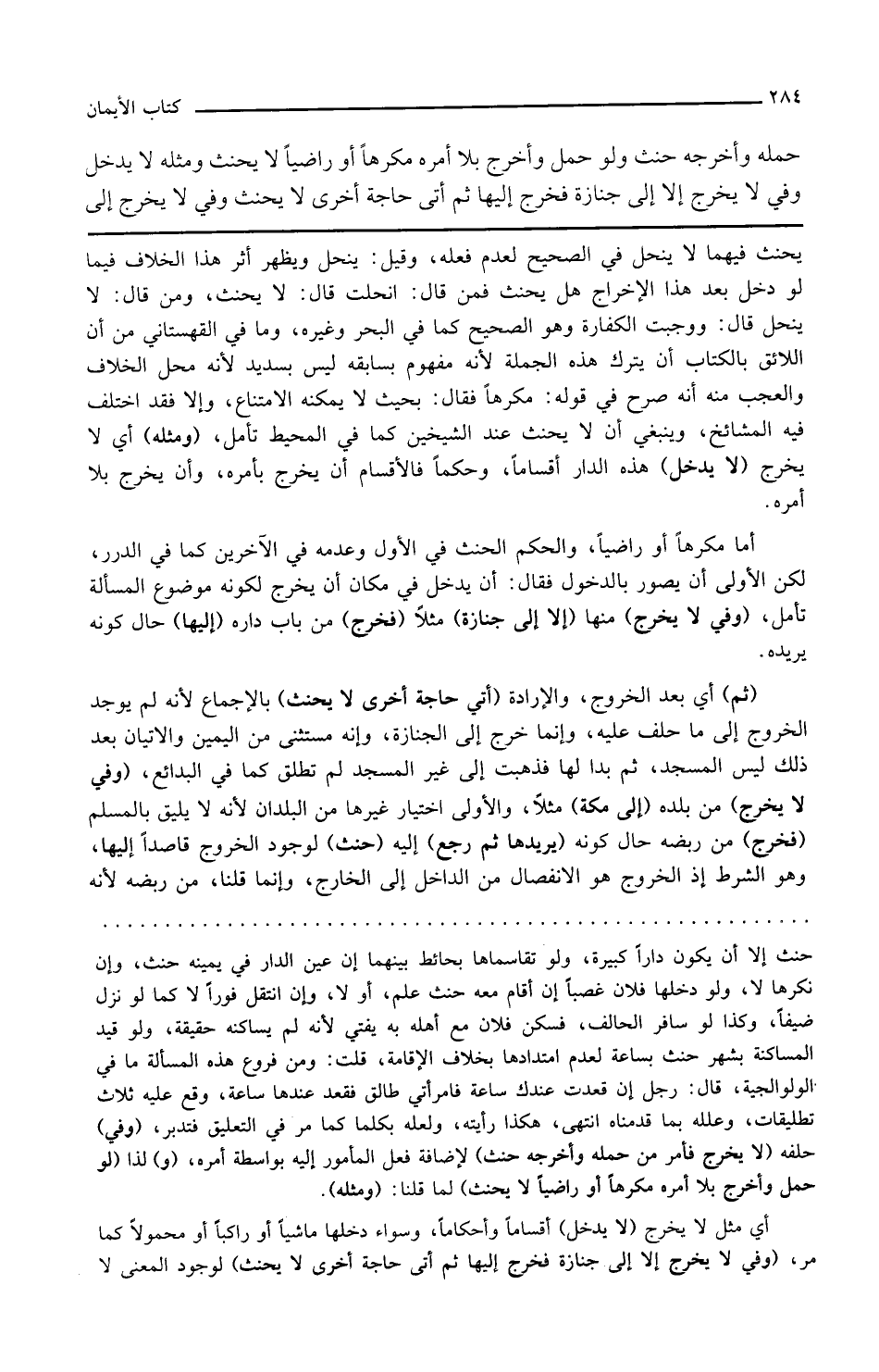 يحنث فيهما لا ينحل في الصحيح لعدم فعله وقيل ينحل ويظهر أثر هذا الخلاف فيما لو دخل بعد هذا الإخراج هل يحنث فمن قال انحلت قال لا يحنث ومن قال لا ينحل قال حنث ووجبت الكفارة وهو الصحيح كما في البحر وغيره وما في القهستاني من أن اللائق بالكتاب أن يترك هذه الجملة لأنه مفهوم بسابقه ليس بسديد لأنه محل الخلاف والعجب منه أنه صرح في قوله مكرها فقال بحيث لا يمكنه الامتناع وإلا فقد اختلف فيه المشايخ وينبغي أن لا يحنث عند الشيخين كما في المحيط تأمل ومثله أي لا يخرج لا يدخل هذه الدار أقساما وحكما فالأقسام أن يخرج بأمره وأن يخرج بلا أمره إما مكرها أو راضيا والحكم الحنث في الأول وعدمه في الآخرين كما في الدرر لكن الأولى أن يصور بالدخول فقال أن يدخل في مكان أن يخرج لكونه موضوع المسألة تأمل وفي لا يخرج منها إلا إلى جنازة مثلا فخرج من باب داره إليها حال كونه يريدها ثم أي بعد الخروج والإرادة أتى حاجة أخرى لا يحنث بالإجماع لأنه لم يوجد الخروج إلى ما حلف عليه وإنما خرج إلى الجنازة وأنه مستثنى من اليمين والإتيان بعد ذلك ليس بخروج كما لو قال إن خرجت منها إلى المسجد فأنت طالق فخرجت تريد المسجد ثم بدا لها فذهبت إلى غير المسجد لم تطلق كما في البدائع