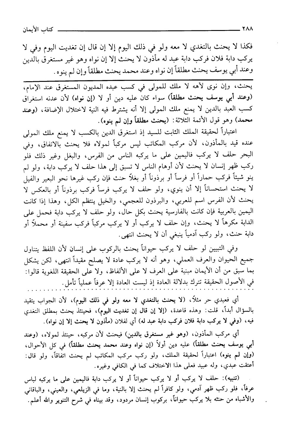يحنث وإن نوى لأنه لا ملك للمولى في كسب عبده المديون المستغرق عند الإمام وعند أبي يوسف يحنث مطلقا سواء كان عليه دين أو لا إن نواه لأن عنده استغراق كسب العبد بالدين لا يمنع ملك المولى إلا أنه يشترط فيه النية لاختلال الإضافة وعند محمد وهو قول الأئمة الثلاثة يحنث مطلقا وإن لم ينوه اعتبارا لحقيقة الملك الثابت للسيد إذ استغراق الدين بالكسب لا يمنع ملك المولى عنده قيد بالمأذون لأن مركب المكاتب ليس مركبا لمولاه فلا يحنث بالاتفاق