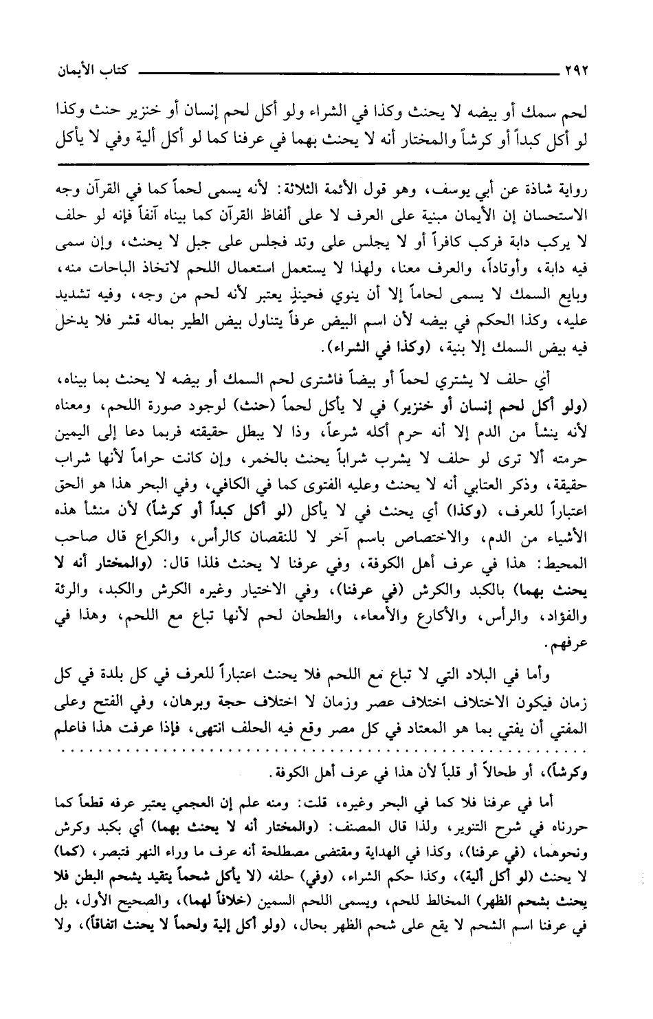وفي البحر هذا هو الحق اعتبارا للعرف وكذا أي يحنث في لا يأكل لو أكل كبدا أو كرشا لأن منشأ هذه الأشياء من الدم والاختصاص باسم آخر لا للنقصان كالرأس والكراع قال صاحب المحيط هذا في عرف أهل الكوفة وفي عرفنا لا يحنث فلذا قال والمختار أنه لا يحنث بهما بالكبد والكرش في عرفنا وفي الاختيار وغيره الكرش والكبد والرئة والفؤاد والرأس والأكارع والأمعاء والطحال لحم لأنها تباع مع اللحم وهذا في عرفهم وأما في البلاد التي لا تباع مع اللحم فلا يحنث اعتبارا للعرف في كل بلدة في كل زمان فيكون الاختلاف اختلاف عصر وزمان لا اختلاف حجة وبرهان