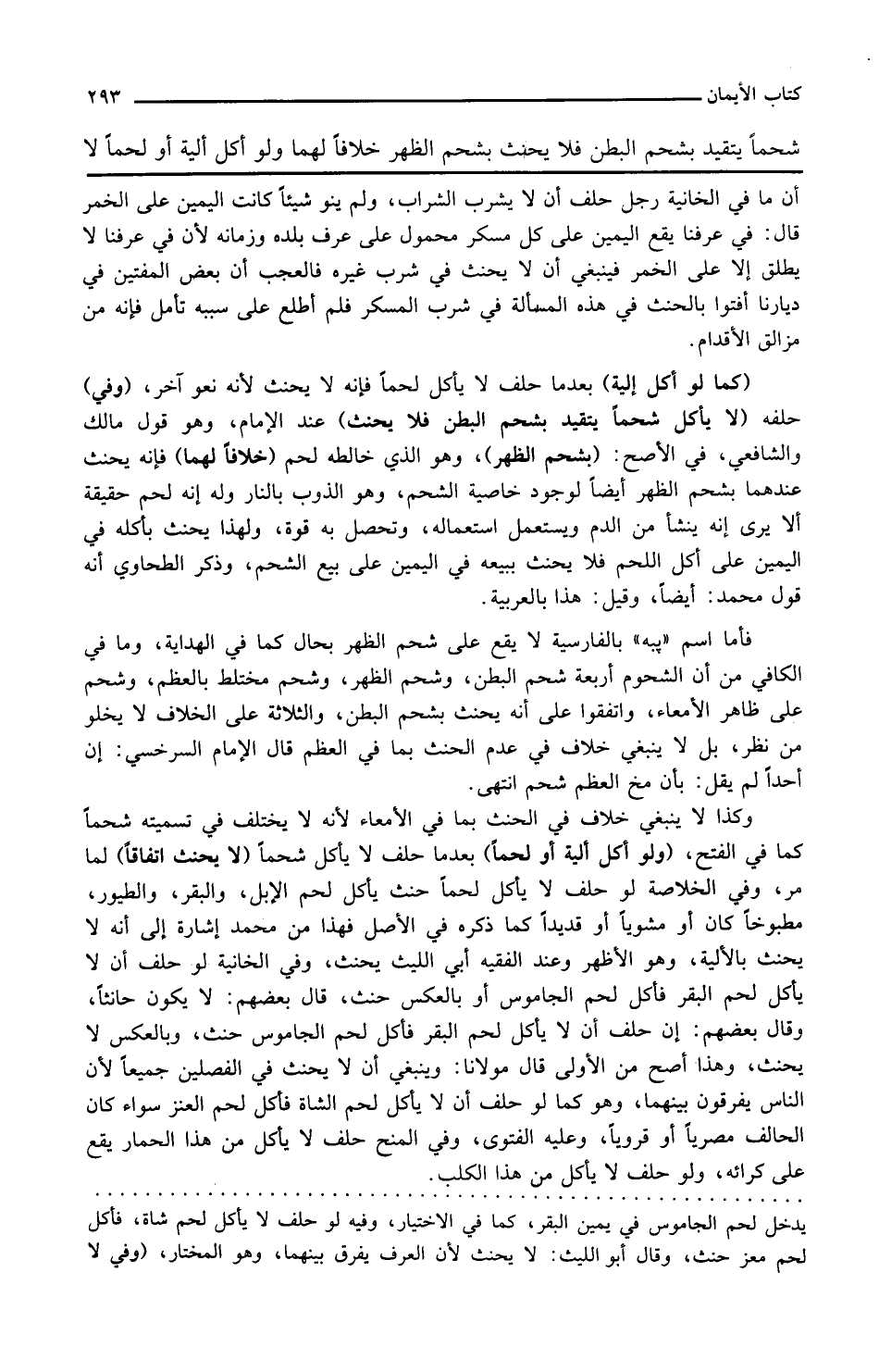 وفي حلفه لا يأكل شحما يتقيد بشحم البطن فلا يحنث عند الإمام وهو قول مالك والشافعي في الأصح بشحم الظهر وهو الذي خالطه لحم خلافا لهما فإنه يحنث عندهما بشحم الظهر أيضا لوجود خاصية الشحم وهو الذوب بالنار وله أنه لحم حقيقة ألا يرى أنه ينشأ من الدم ويستعمل استعماله وتحصل به قوة ولهذا يحنث بأكله في اليمين على أكل اللحم فلا يحنث ببيعه في اليمين على بيع الشحم وذكر الطحاوي أنه قول محمد أيضا وقيل هذا بالعربية فأما اسم يبه بالفارسية لا يقع على شحم الظهر بحال كما في الهداية وما في الكافي من أن الشحوم أربعة شحم البطن وشحم الظهر وشحم مختلط بالعظم وشحم على ظاهر الأمعاء واتفقوا على أنه يحنث بشحم البطن والثلاثة على الخلاف لا يخلو من نظر بل لا ينبغي خلاف في عدم الحنث بما في العظم قال الإمام السرخسي إن أحدا لم يقل بأن مخ العظم شحم انتهى وكذا لا ينبغي خلاف في الحنث بما في الأمعاء لأنه لا يختلف في تسميته شحما كما في الفتح ولو أكل ألية أو لحما بعدما حلف لا يأكل شحما لا يحنث اتفاقا لما مر
