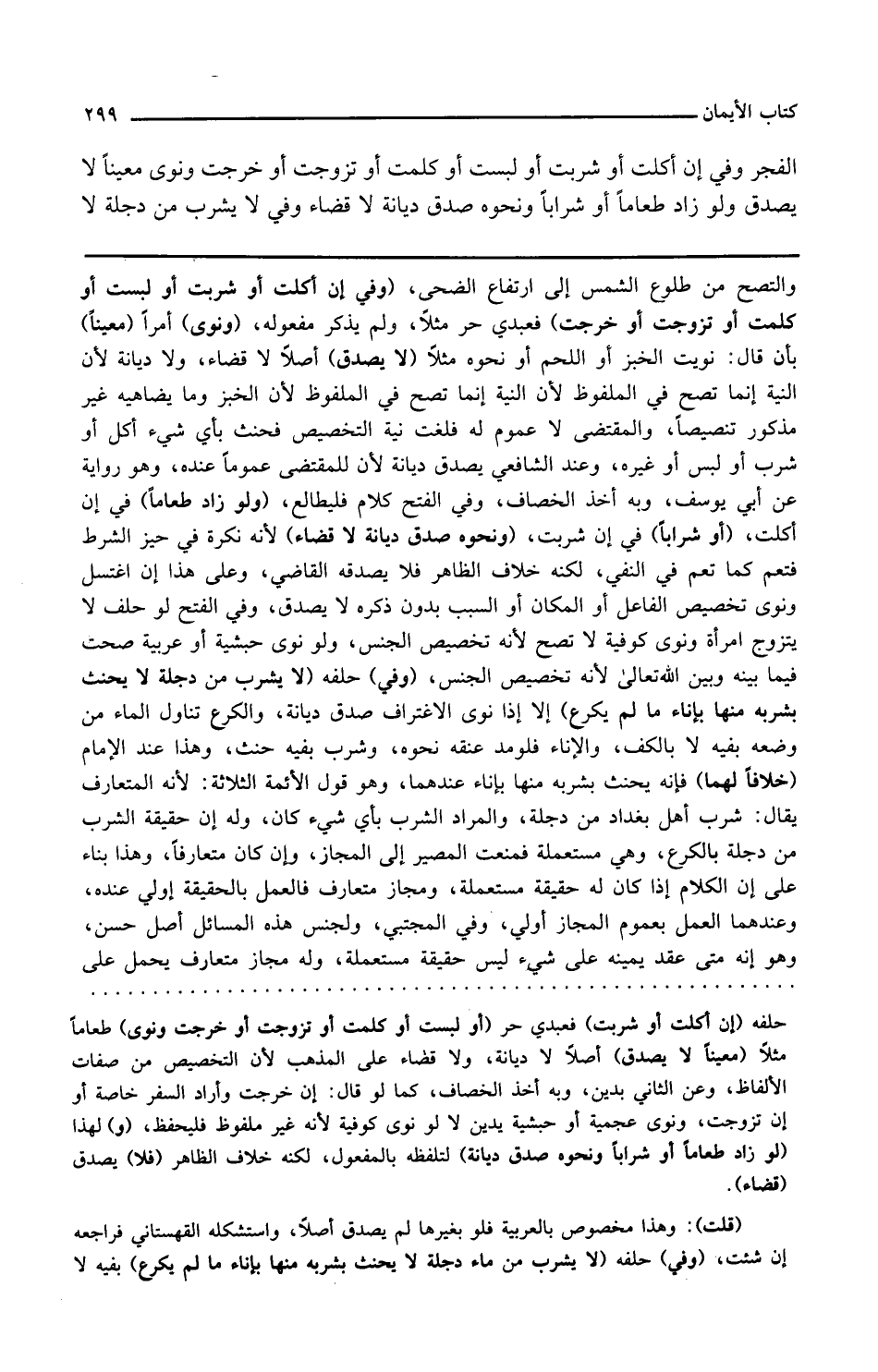 والتصبح من طلوع الشمس إلى ارتفاع الضحى وفي إن أكلت أو شربت أو لبست أو كلمت أو تزوجت أو خرجت فعبدي حر مثلا ولم يذكر مفعوله ونوى أمرا معينا بأن قال نويت الخبز أو اللحم أو نحوه مثلا لا يصدق أصلا لا قضاء ولا ديانة لأن النية إنما تصح في الملفوظ لأن الخبز وما يضاهيه غير مذكور تنصيصا والمقتضى لا عموم له فلغت نية التخصيص فحنث بأي شيء أكل أو شرب أو لبس أو غيره وعند الشافعي يصدق ديانة لأن للمقتضى عموما عنده وهو رواية عن أبي يوسف وبه أخذ الخصاف