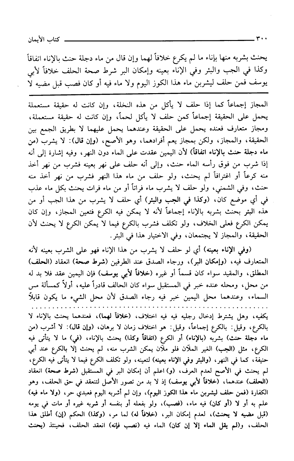 وفي الاختيار هذا في البئر وأما في الحب إن كان ملآنا يمكن الشرب منه لا يحنث إلا بالكرع عنده كما في النهر وفي الإناء بعينه أي لو حلف لا يشرب من هذا الإناء فهو على الشرب بعينه لأنه المتعارف فيه وإمكان البر ورجاء الصدق عند الطرفين شرط صحة انعقاد الحلف المطلق والمقيد سواء كان قسما أو غيره خلافا لأبي يوسف فإن اليمين عقد فلا بد له من محل ومحله عنده خبر في المستقبل سواء كان الحالف قادرا عليه أو لا كمسألة مس السماء وعندهما محل اليمين خبر في رجاء الصدق لأن محل الشيء ما يكون قابلا