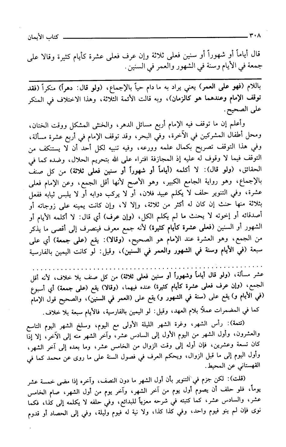 وإن عرف أي قال لا أكلمه الأيام أو الشهور أو السنين فعلى عشرة كأيام كثيرة لأنه جمع معرف فينصرف إلى أقصى ما يذكر من الجمع وهو العشرة عند الإمام هو الصحيح وقالا يقع على جمعة أي على سبعة في الأيام وسنة في الشهور والعمر في السنين وقيل لو كانت اليمين بالفارسية