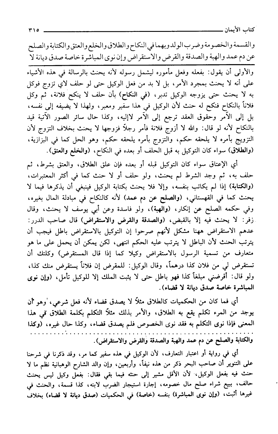 والأولى أن يقول بفعله وفعل مأموره ليشمل رسوله لأنه يحنث بالرسالة في هذه الأشياء على أنه لا يحنث بمجرد الأمر بل لا بد من فعل الوكيل حتى لو حلف لا يتزوج فوكل به لا يحنث حتى يزوجه الوكيل تدبر في النكاح بأن حلف لا ينكح فلانة ثم وكل فلانا بالنكاح فنكح له حنث لأن الوكيل في هذا سفير ومعبر ولهذا لا يضيفه إلى نفسه بل الآمر وحقوق العقد ترجع إلى الآمر لا إليه وكذا حال سائر الصور الآتية قيد بالنكاح لأنه لو قال والله لا أزوج فلانة فأمر رجلا فزوجها لا يحنث بخلاف التزوج لأن التزويج بأمره لا يلحقه حكم والتزوج بأمره يلحقه حكم وهو الحل كما في البزازية والطلاق سواء كان التوكيل به قبل الحلف أو بعده في النكاح والخلع والعتق أي الإعتاق سواء كان التوكيل قبله أو بعده فإن علق الطلاق والعتق بشرط ثم حلف به ثم وجد الشرط لم يحنث ولو حلف أولا حنث كما في أكثر المعتبرات والكتابة إذا لم يكاتب بنفسه وإلا فلا يحنث بكتابة الوكيل فينبغي أن يذكرها فيما لا يحنث كما في القهستاني والصلح عن دم عمد لأنه كالنكاح في مبادلة المال بغيره وفي حكمه الصلح عن إنكار والهبة ولو فاسدة وعن أبي يوسف لا يحنث