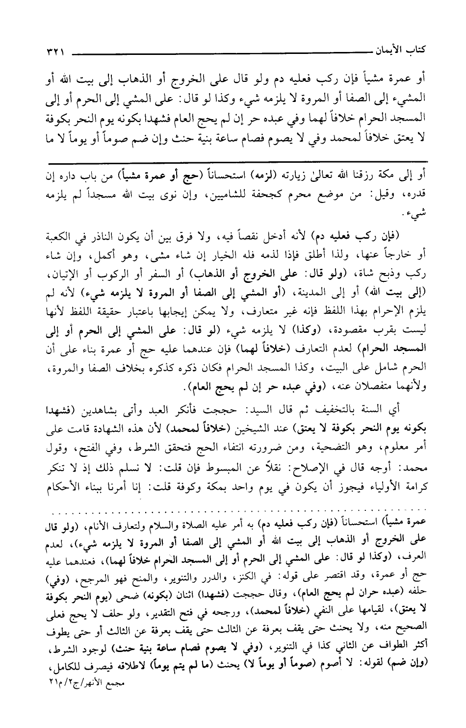 وكذا لا يلزمه شيء لو قال علي المشي إلى الحرم أو إلى المسجد الحرام لعدم التعارف خلافا لهما فإن عندهما عليه حج أو عمرة بناء على أن الحرم شامل على البيت وكذا المسجد الحرام فكان ذكره كذكره بخلاف الصفا والمروة ولأنهما منفصلان عنه