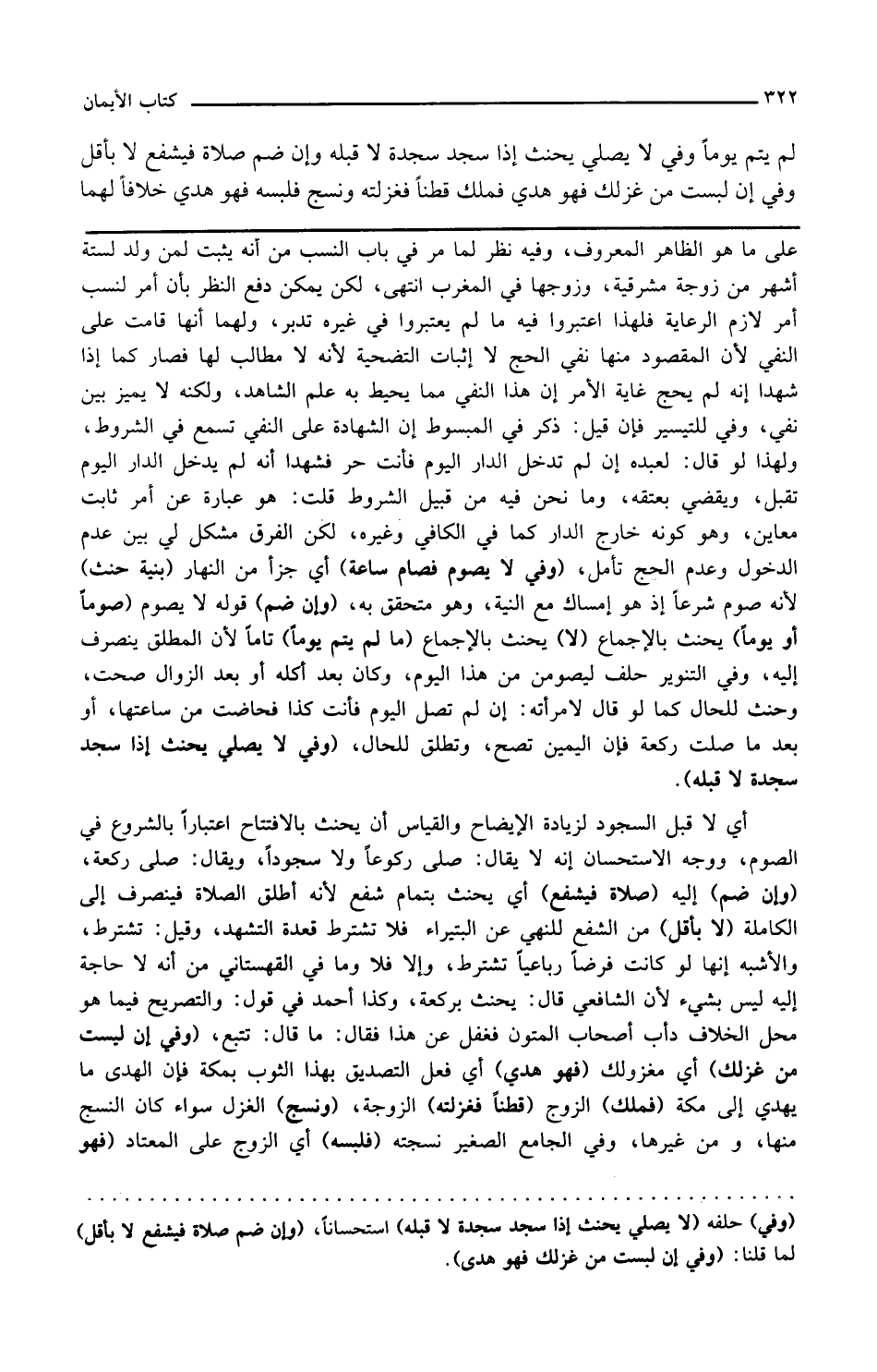وفي التنوير حلف ليصومن من هذا اليوم وكان بعد أكله أو بعد الزوال صحت وحنث للحال كما لو قال لامرأته إن لم تصلي اليوم فأنت كذا فحاضت من ساعتها أو بعدما صلت ركعة فإن اليمين تصح وتطلق للحال وفي لا يصلي يحنث إذا سجد سجدة لا قبله أي لا قبل السجود لزيادة الإيضاح والقياس أن يحنث بالافتتاح اعتبارا بالشروع في الصوم ووجه الاستحسان أنه لا يقال صلى ركوعا ولا سجودا ويقال صلى ركعة