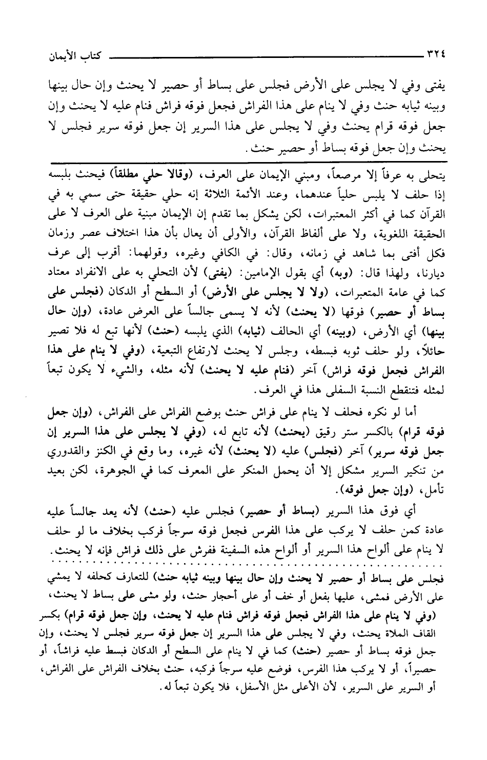 وإن حال بينها أي الأرض وبينه أي الحالف ثيابه الذي يلبسه حنث لأنها تبع له فلا تصير حائلا ولو خلع ثوبه فبسطه وجلس لا يحنث لارتفاع التبعية وفي لا ينام على هذا الفراش فجعل فوقه فراش آخر فنام عليه لا يحنث لأنه مثله والشيء لا يكون تبعا لمثله فتنقطع النسبة السفلى هذا في العرف أما لو نكره فحلف لا ينام على فراش حنث بوضع الفراش على الفراش