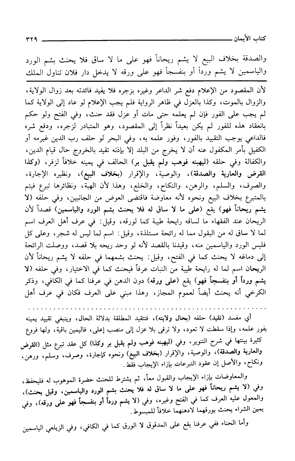 وفي حلفه لا يشم ريحانا فهو يقع على ما لا ساق له فلا يحنث بشم الورد والياسمين قصدا لأن الريحان عند الفقهاء ما لساقه رائحة طيبة كما لورقه وقيل في عرف أهل العراق اسم لما لا ساق له من البقول مما له رائحة مستلذة وقيل اسم لما ليس له شجر وعلى كل فليس الورد والياسمين منه وقيدنا بالقصد لأنه لو وجد ريحه بلا قصد ووصلت الرائحة إلى دماغه لا يحنث كما في الفتح وقيل يحنث بشمهما في حلفه لا يشم ريحانا لأن الريحان اسم لما له رائحة طيبة من النبات عرفا فيحنث كما في الاختيار وفي حلفه لا يشم وردا أو بنفسجا فهو يقع على ورقة دون الدهن في عرفنا كما في الكافي وذكر الكرخي أنه يحنث أيضا لعموم المجاز وهذا مبني على العرف فكان في عرف أهل