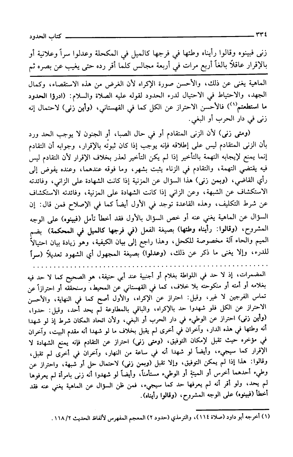 الماهية يغني عن ذلك والأحسن صورة الإكراه لأن الغرض من هذه الاستقصاء وكمال الجهد والاحتياط في الاحتيال لدرء الحدود لقوله عليه الصلاة والسلام ادرءوا الحدود ما استطعتم فالأحسن الاحتراز عن الكل كما في القهستاني وأين زنى لاحتمال أنه زنى في دار الحرب أو البغي ومتى زنى لأن الزنى المتقادم أو في حال الصبا أو الجنون لا يوجب الحد ورد بأن الزنى المتقادم ليس على إطلاقه فإنه يوجب إذا كان ثبوته بالإقرار وجوابه أن التقادم إنما يمنع لإيجابه التهمة بالتأخير إذا لم يكن التأخير لعذر بخلاف الإقرار لأن التقادم ليس فيه ما يقتضي التهمة والتقادم في الزنا يثبت بشهر وما فوقه عندهما وعنده يفوض إلى رأي القاضي وبمن زنى هذا السؤال عن المزنية إذا كانت الشهادة على الزاني وفائدته الاستكشاف عن الشبهة وعن الزاني إذا كانت الشهادة على المزنية وفائدته الاستكشاف عن شرط التكليف وهذه القاعدة توجد في الأول أيضا كما في الإصلاح فمن قال إن السؤال عن الماهية يغني عنه أو خص السؤال بالأول فقد أخطأ تأمل فبينوه على الوجه المشروح وقالوا رأيناه وطئها بصيغة الفعل في فرجها كالميل في المكحلة بضم الميم والحاء آلة مخصوصة للكحل وهذا راجع إلى بيان الكيفية وهو زيادة بيان احتيالا للدرء وإلا يغني ما ذكر عن ذلك وعدلوا بصيغة المجهول أي الشهود تعديلا سرا