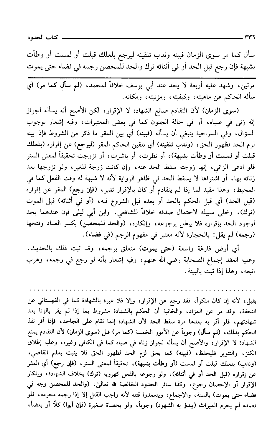 وفي السراجية ينبغي أن يسأله فبينه أي بين المقر ما ذكر من الشرط فإذا بينه لزم الحد لظهور الحق