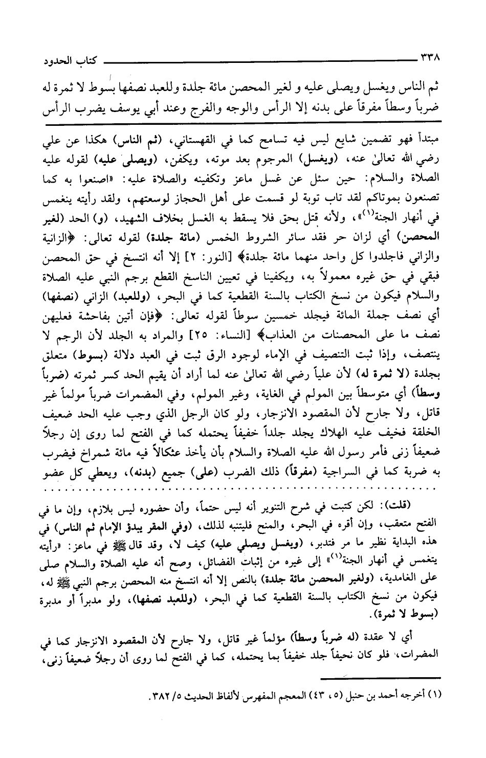 و الحد لغير المحصن أي لزان حر فقد سائر الشروط الخمس مائة جلدة لقوله تعالى الزانية والزاني فاجلدوا كل واحد منهما مائة جلدة إلا أنه انتسخ في حق المحصن فبقي في حق غيره معمولا به ويكفينا في تعيين الناسخ القطع برجم النبي عليه الصلاة والسلام فيكون من نسخ الكتاب بالسنة القطعية كما في البحر وللعبد الزاني نصفها أي نصف جملة المائة فيجلد خمسين سوطا لقوله تعالى فإن أتين بفاحشة فعليهن نصف ما على المحصنات من العذاب والمراد به الجلد لأن الرجم لا ينتصف وإذا ثبت التنصيف في الإماء لوجود الرق ثبت في العبد دلالة بسوط متعلق بجلدة لا ثمرة له لأن عليا رضي الله تعالى عنه لما أراد أن يقيم الحد كسر ثمرته ضربا وسطا أي متوسطا بين المولم في الغاية وغير المولم