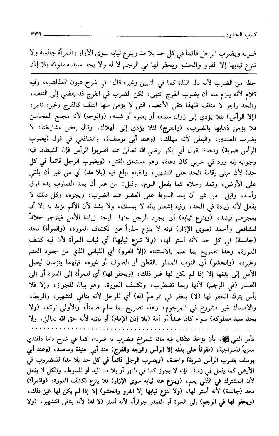 ويحفر لها أي للمرأة إلى السرة أو إلى الصدر في الرجم لأنها ربما تضطرب وتكشف العورة وهو بيان للجواز وإلا فلا بأس بترك الحفر لها لا يحفر في الرجم له أي للرجل لأنه ينافي التشهير والربط والإمساك غير مشروع في المرجوم وهذا صريح بما علم ضمنا والأولى تركه ولا يحد سيد مملوكه سواء كان عبدا أو أمة بلا إذن الإمام أو نائبه لأنه حق الله تعالى ولا