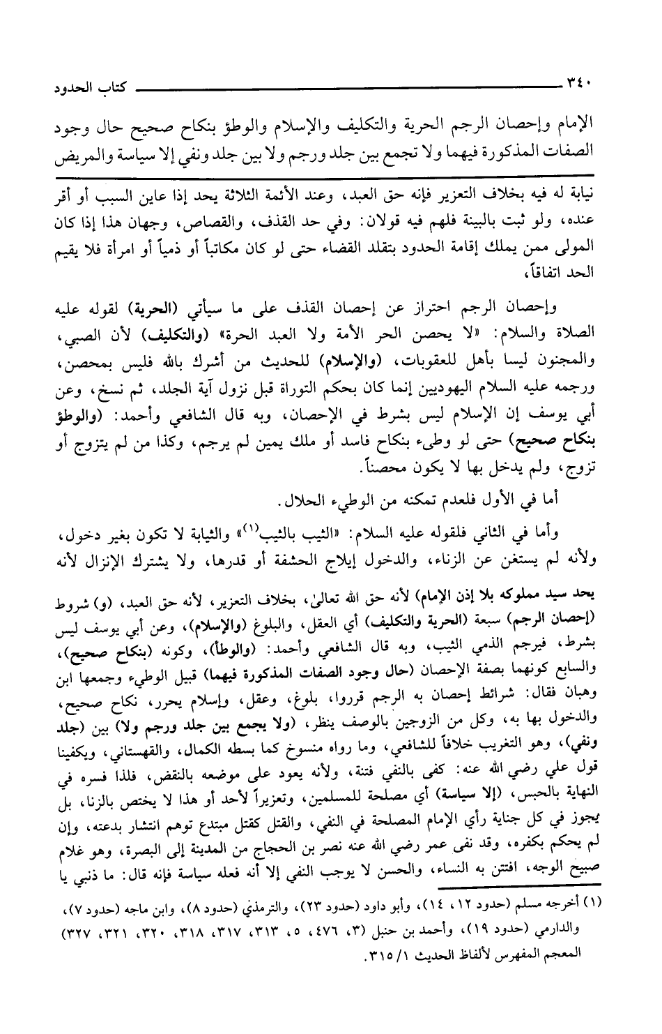 نيابة له فيه بخلاف التعزير فإنه حق العبد وعند الأئمة الثلاثة يحد إذا عاين السبب أو أقر عنده ولو ثبت بالبينة فلهم فيه قولان وفي حد القذف والقصاص وجهان هذا إذا كان المولى ممن يملك إقامة الحدود بتقلد القضاء حتى لو كان مكاتبا أو ذميا أو امرأة فلا يقيم الحد اتفاقا وإحصان الرجم احتراز عن إحصان القذف على ما سياتي الحرية لقوله عليه الصلاة والسلام لا يحصن الحر الأمة ولا العبد الحرة والتكليف لأن الصبي والمجنون ليسا بأهل للعقوبات والإسلام للحديث من أشرك بالله فليس بمحصن ورجمه عليه السلام اليهوديين إنما كان بحكم التوراة قبل نزول آية الجلد ثم نسخ وعن أبي يوسف أن الإسلام ليس بشرط في الإحصان وبه قاله الشافعي وأحمد والوطء بنكاح صحيح حتى لو وطئ بنكاح فاسد أو ملك يمين لم يرجم وكذا من لم يتزوج أو تزوج ولم يدخل بها لا يكون محصنا أما في الأول فلعدم تمكنه من الوطء الحلال وأما في الثاني فلقوله عليه السلام الثيب وبالثيب والثيابة لا تكون بغير دخول ولأنه لم يستغن عن الزناء والدخول إيلاج الحشفة أو قدرها ولا يشترط الإنزال لأنه
