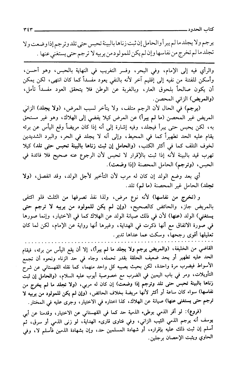والحامل إن ثبت زناها بالبينة تحبس حتى تلد كي لا تهرب قيد بالبينة لأنه إذا ثبت بالإقرار لا تحبس لأن الرجوع عنه صحيح فلا فائدة في الحبس وترجم الحامل المحصنة إذا وضعت أي بعد وضع الولد إن كان له مرب لأن التأخير لأجل الولد وقد انفصل ولا تجلد الحامل غير المحصنة ما لم تلد و تخرج من نفاسها لأنه نوع مرض ولذا نفذ تصرفها من الثلث فلو اكتفى جاز والحائض كالصحيح وإن لم يكن للمولود من يربيه لا ترجم حتى يستغني الولد عنها لأن في ذلك صيانة الولد عن الهلاك كما في الاختيار وإنما صورها في صورة الاتفاق مع أنها ذكرت في الهداية وغيرها أنها رواية عن الإمام لكن لما كان تعليلها أقوى رجحها وسكت عما عداها تدبر