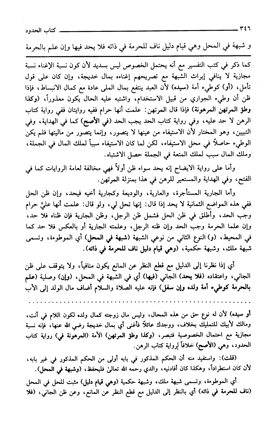و النوع الثاني من نوعي الشبهة شبهة في المحل أي الموطوءة وتسمى شبهة ملك وشبهة حكمية وهي قيام دليل ناف للحرمة في ذاته أي إذا نظرنا إلى الدليل مع قطع النظر عن المانع يكون منافيا ولا يتوقف على ظن الجاني واعتقاده فلا يحد الجاني فيها أي في الشبهة في المحل