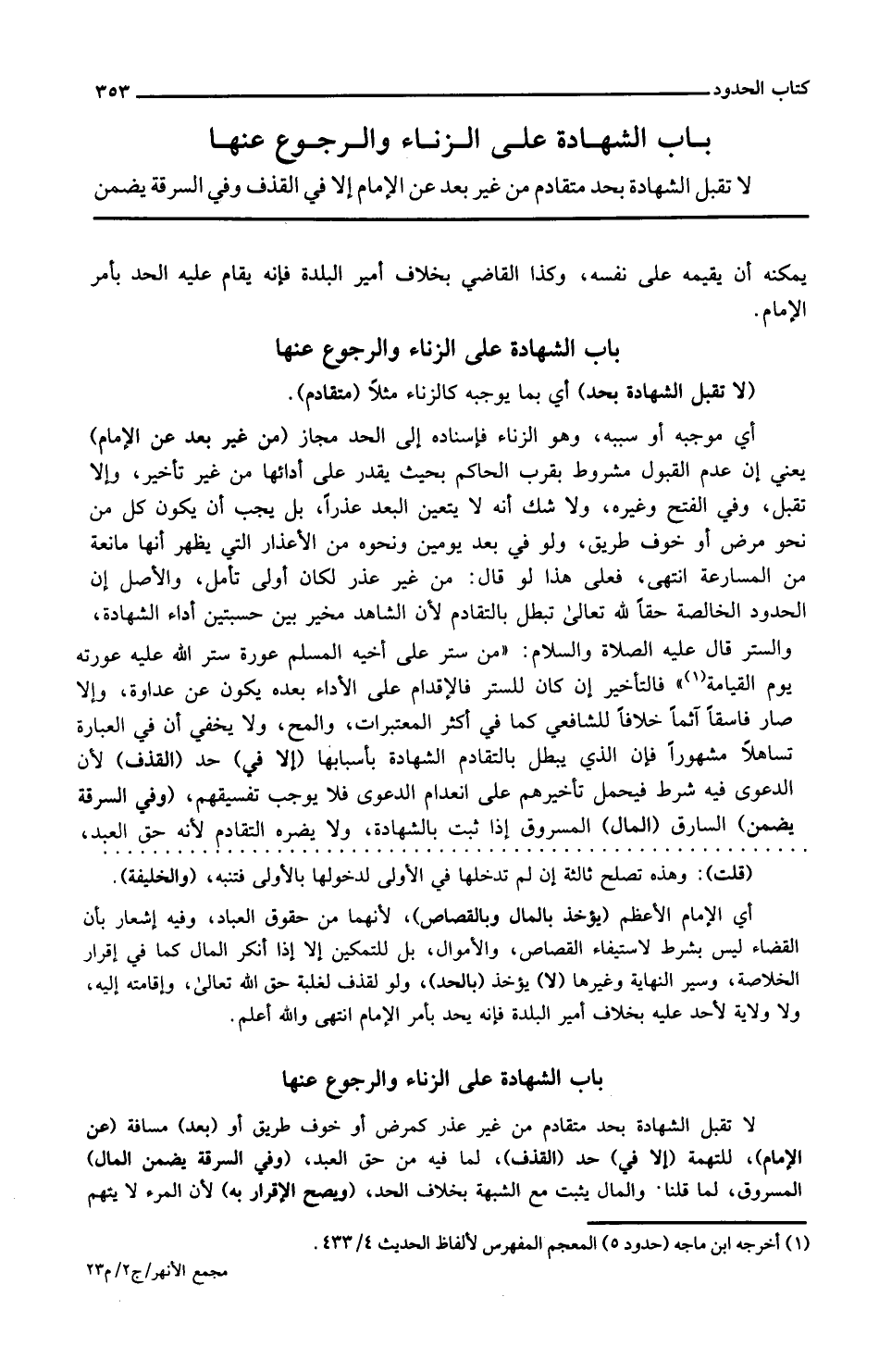 لا تقبل الشهادة بحد أي بما يوجبه كالزناء مثلا متقادم أي موجبه أو سببه وهو الزناء فإسناده إلى الحد مجاز من غير بعد عن الإمام يعني أن عدم القبول مشروط بقرب الحاكم بحيث يقدر على أدائها من غير تأخير وإلا تقبل
