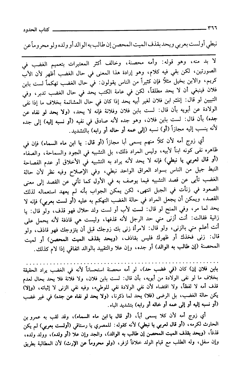 ولا يحد لو نفاه عن جده بأن قال لست بابن فلان وهو جده لأنه صادق في نفيه أو نسبه إليه إلى جده لأنه ينسب إليه مجازا أو نسبه إلى عمه أو خاله أو رابه بالتشديد أي زوج أمه لأن كلا منهم يسمى أبا مجازا أو قال يا ابن ماء السماء فإن في ظاهره نفي كونه ابنا لأبيه وليس المراد ذلك بل التشبيه في الجود والسماحة والصفاء أو قال لعربي يا نبطي فإنه لا يحد لأنه يراد به التشبيه في الأخلاق أو عدم الفصاحة النبط جيل من الناس بسواد العراق الواحد نبطي