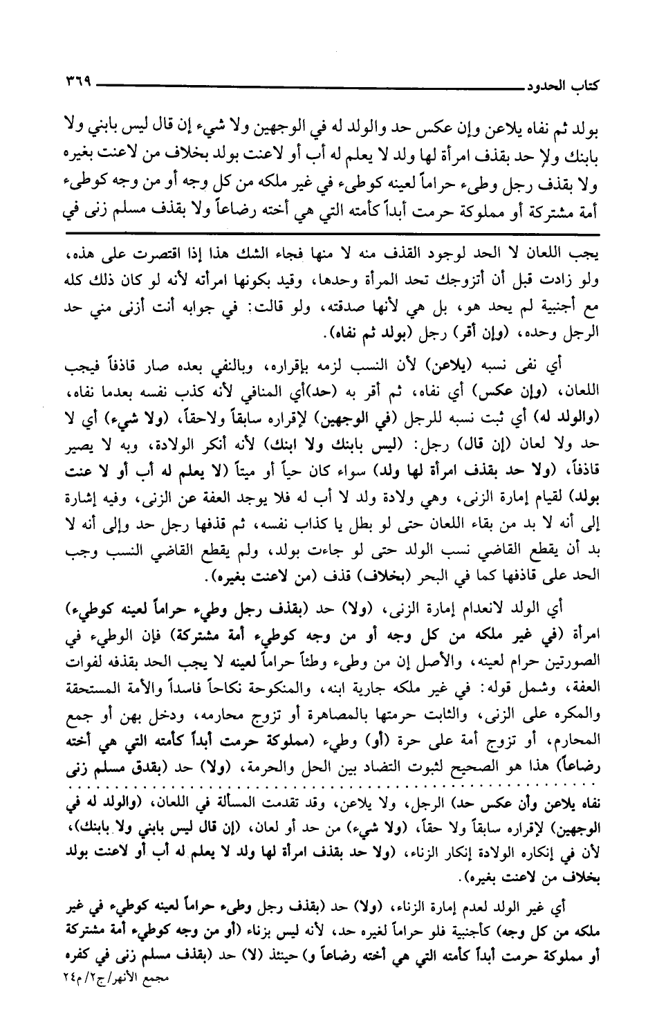 ولا حد بقذف رجل وطئ حراما لعينه كوطء امرأة في غير ملكه من كل وجه أو من وجه كوطء أمة مشتركة فإن الوطء في الصورتين حرام لعينه والأصل أن من وطئ وطئا حراما لعينه لا يجب الحد بقذفه لفوات العفة وشمل قوله في غير ملكه جارية ابنه والمنكوحة نكاحا فاسدا والأمة المستحقة والمكره على الزنى والثابت حرمتها بالمصاهرة أو تزوج محارمه ودخل بهن أو جمع المحارم أو تزوج أمة على حرة أو وطئ مملوكة حرمت أبدا كأمته التي هي أخته رضاعا هذا هو الصحيح لثبوت التضاد بين الحل والحرمة
