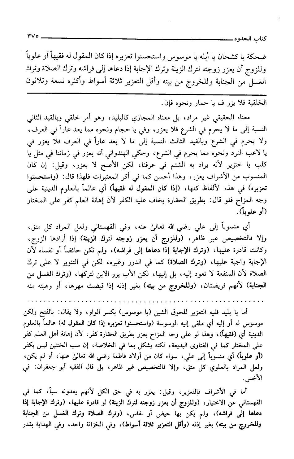 الخلقية فلا يعزر في يا حمار ونحوه فإن معناه الحقيقي غير مراد بل معناه المجازي كالبليد وهو أمر خلقي وبالقيد الثاني النسبة إلى ما لا يحرم في الشرع فلا يعزر وفي يا حجام ونحوه مما يعد عارا في العرف ولا يحرم في الشرع وبالقيد الثالث النسبة إلى ما لا يعد عارا في العرف فلا يعزر في يا لاعب النرد ونحوه مما يحرم في الشرع وحكى الهندواني أنه يعزر في زماننا في مثل يا كلب يا خنزير لأنه يراد به الشتم في عرفنا لكن الأصح لا يعزر وقيل إن كان المنسوب من الأشراف يعزر وهذا أحسن كما في أكثر المعتبرات فلهذا قال واستحسنوا تعزيره في هذه الألفاظ كلها إذا كان المقول له فقيها أي عالما بالعلوم الدينية على وجه المزاح فلو قال بطريق الحقارة يخاف عليه الكفر لأن إهانة العلم كفر على المختار أو علويا أي منسوبا إلى علي رضي الله تعالى عنه