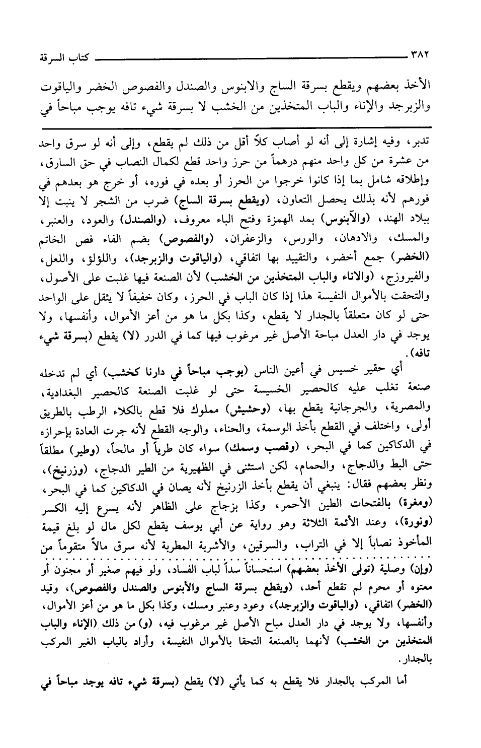 ويقطع بسرقة الساج ضرب من الشجر لا ينبت إلا ببلاد الهند والآبنوس بمد الهمزة وفتح الباء معروف والصندل والعود والعنبر والمسك والأدهان والورس والزعفران والفصوص بضم الفاء فص الخاتم الخضر جمع أخضر والتقييد بها اتفاقي والياقوت والزبرجد واللؤلؤ واللعل والفيروزج والإناء والباب المتخذين من الخشب لأن الصنعة فيها غلبت على الأصول والتحقت بالأموال النفيسة هذا إذا كان الباب في الحرز وكان خفيفا لا يثقل على الواحد حتى لو كان متعلقا بالجدار لا يقطع وكذا بكل ما هو من أعز الأموال وأنفسها ولا يوجد في دار العدل مباحة الأصل غير مرغوب فيها كما في الدرر