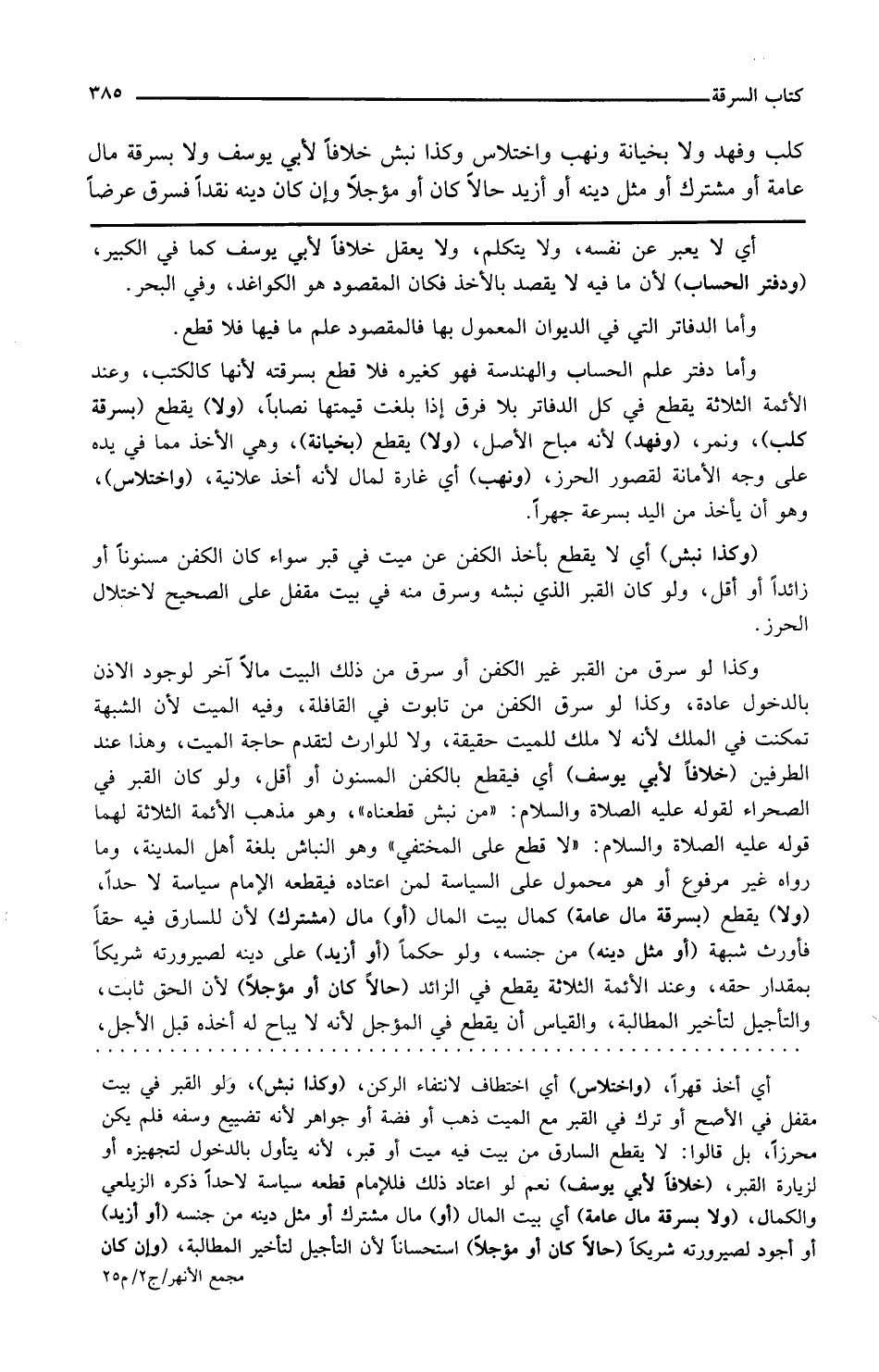 وفي البحر وأما الدفاتر التي في الديوان المعمول بها فالمقصود علم ما فيها فلا قطع وأما دفتر علم الحساب والهندسة فهو كغيره فلا قطع بسرقته لأنها كالكتب وعند الأئمة الثلاثة يقطع في كل الدفاتر بلا فرق إذا بلغت قيمتها نصابا