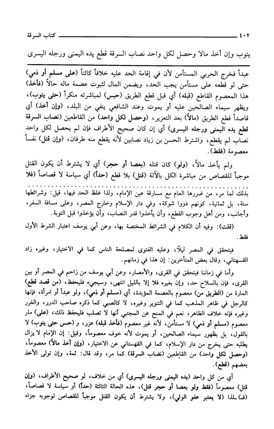 وإن أخذ أي قاصدا قطع الطريق مالا بعد التعزير وحصل لكل واحد من القاطعين نصاب السرقة قطع يده اليمنى ورجله اليسرى أي إن كان صحيح الأطراف فإن لم يحصل لكل واحد نصاب لم يقطع واشترط الحسن بن زياد نصابين لأنه يقطع منه طرفان