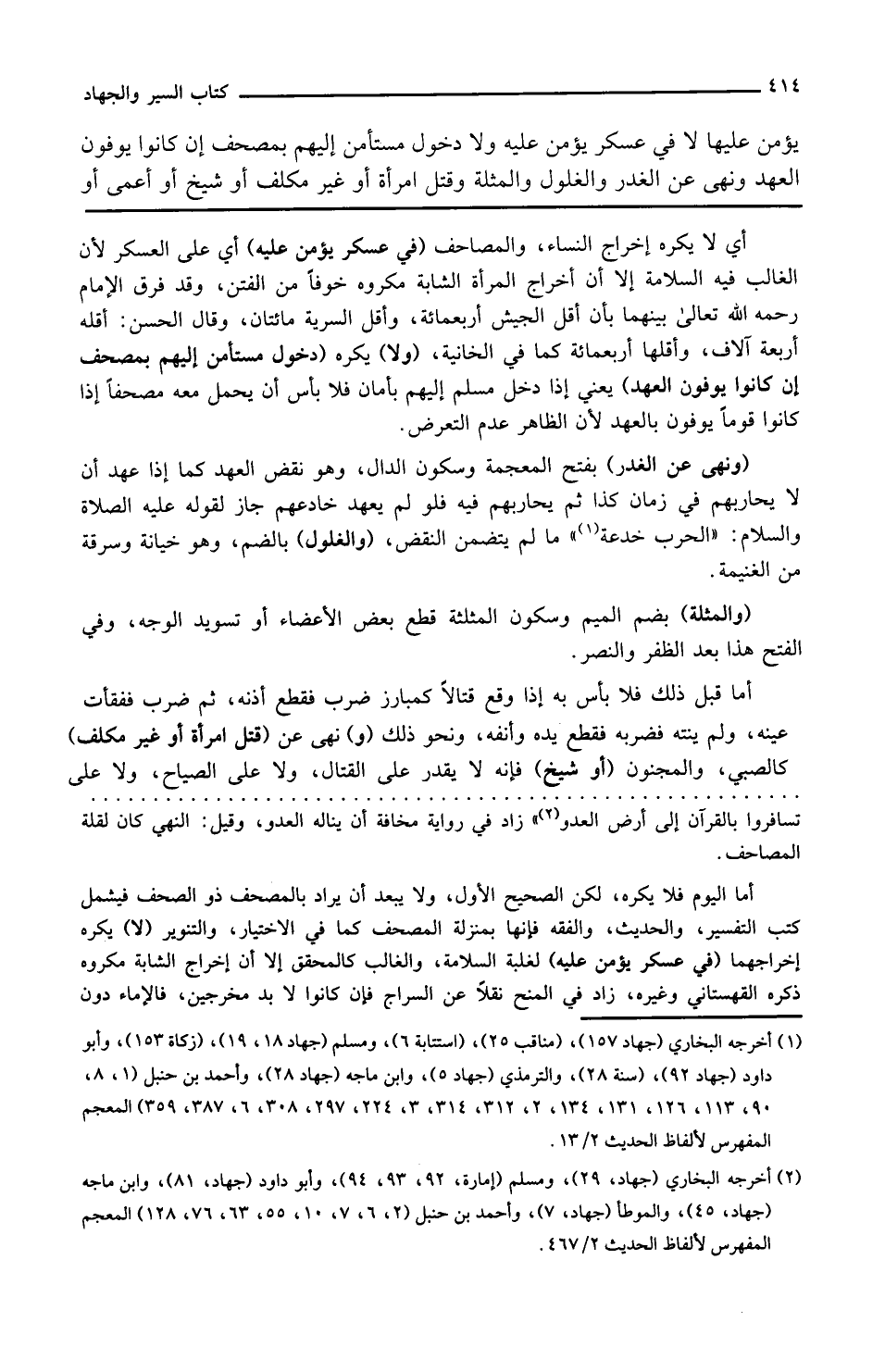 ونهى عن الغدر بفتح المعجمة وسكون الدال وهو نقض العهد كما إذا عهد أن لا يحاربهم في زمان كذا ثم يحاربهم فيه فلو لم يعهد وخادعهم جاز لقوله عليه الصلاة والسلام الحرب خدعة ما لم يتضمن النقض والغلول بالضم وهو خيانة وسرقة من الغنيمة والمثلة بضم الميم وسكون المثلثة قطع بعض الأعضاء أو تسويد الوجه