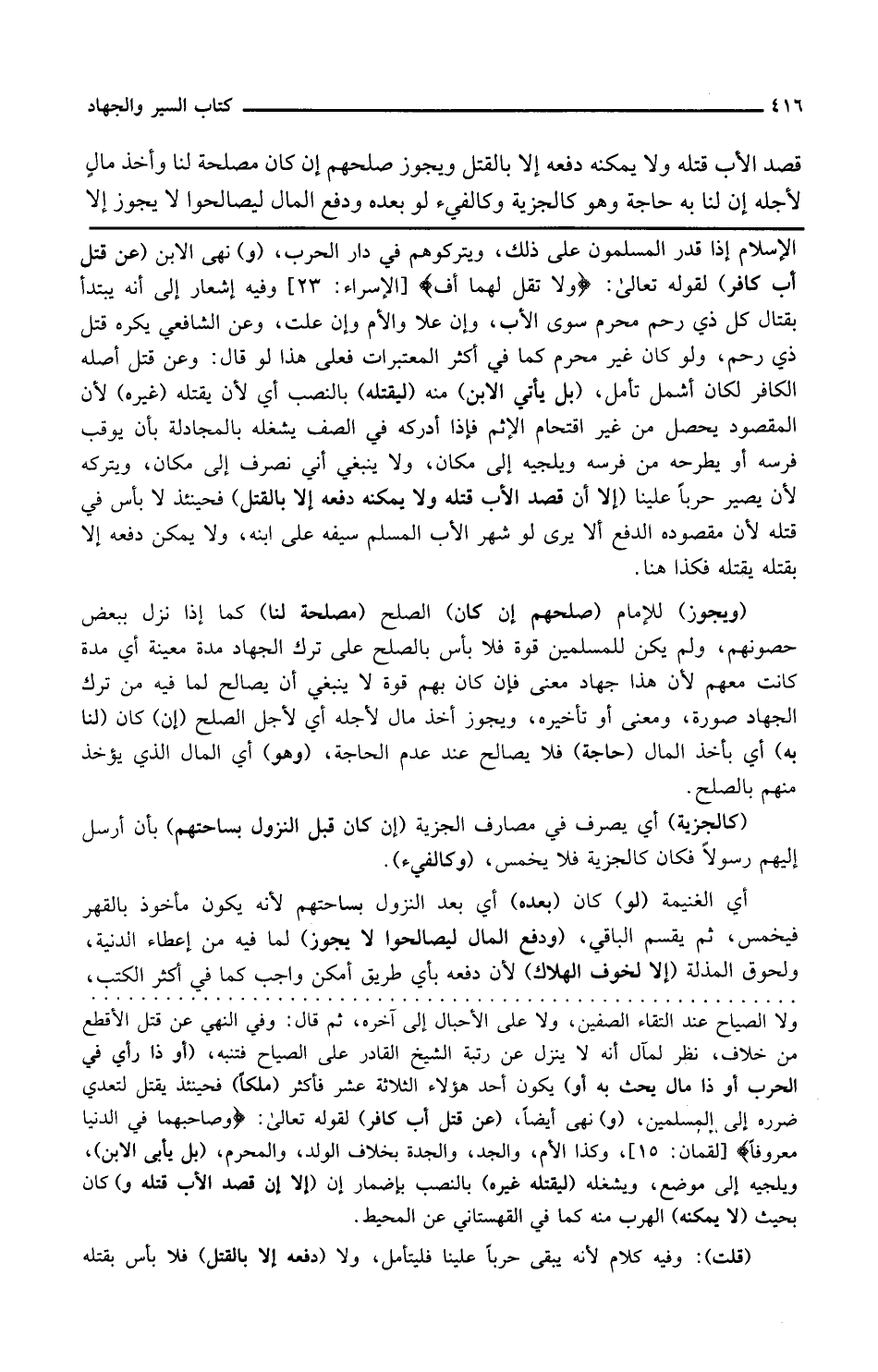 و نهى الابن عن قتل أب كافر لقوله تعالى فلا تقل لهما أف وفيه إشعار إلى أنه يبتدئ بقتال كل ذي رحم محرم سوى الأب وإن علا والأم وإن علت