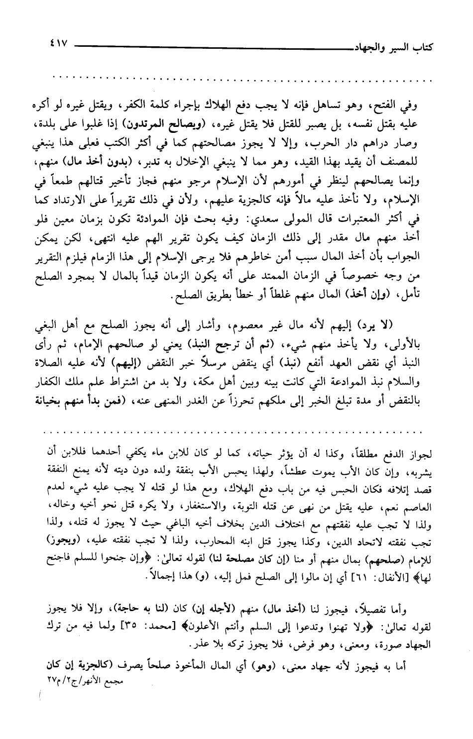 بدون أخذ مال منهم وإنما يصالحهم لينظر في أمورهم لأن الإسلام مرجو منهم فجاز تأخير قتالهم طمعا في الإسلام ولا نأخذ عليه مالا فإنه كالجزية عليهم ولأن في ذلك تقريرا على الارتداد كما في أكثر المعتبرات قال المولى سعدي وفيه بحث فإن الموادئة تكون بزمان معين فلو أخذ منهم مال مقدر إلى ذلك الزمان كيف يكون تقريرا لهم عليه انتهى