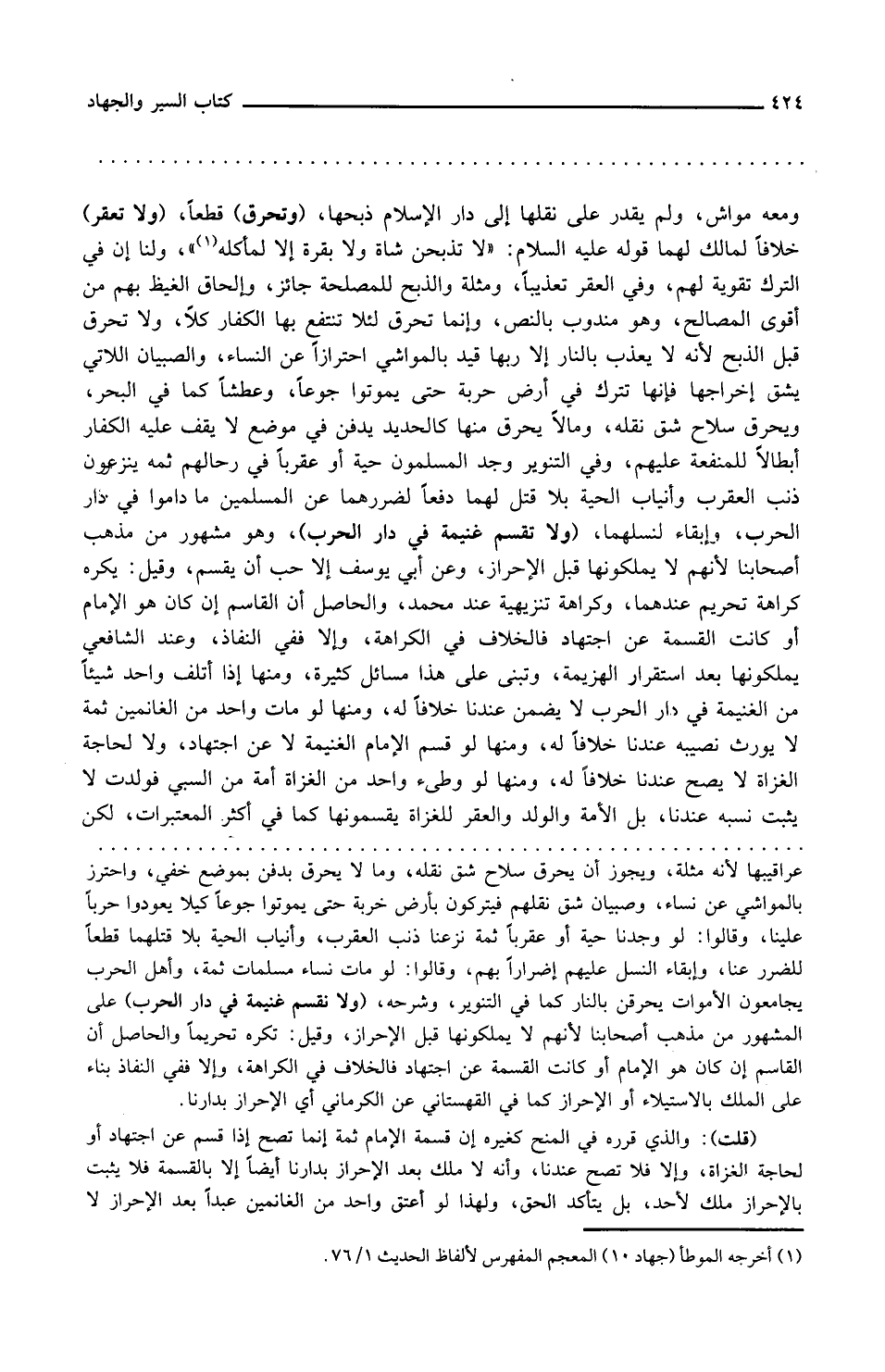 ومعه مواش ولم يقدر على نقلها إلى دار الإسلام ذبحها وتحرق قطعا ولا تعقر خلافا لمالك لهما قوله عليه السلام لا تذبحن شاة ولا بقرة إلا لمأكلة ولنا إن في الترك تقوية لهم وفي العقر تعذيبا ومثلة والذبح للمصلحة جائز وإلحاق الغيظ بهم من أقوى المصالح وهو مندوب بالنص وإنما تحرق لئلا تنتفع بها الكفار كلا ولا تحرق قبل الذبح لأنه لا يعذب بالنار إلا ربها