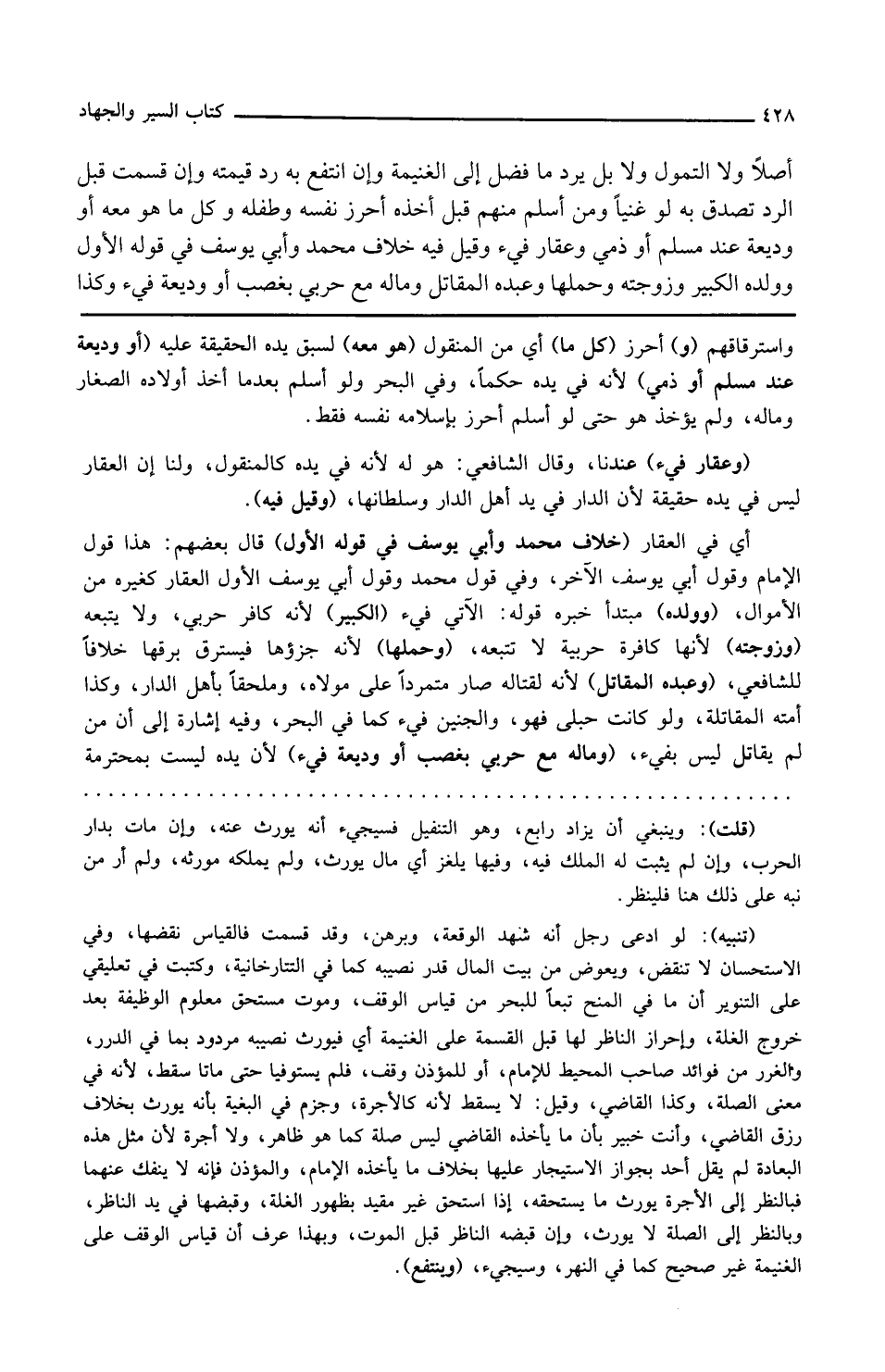 وفي قول محمد وقول أبي يوسف الأول العقار كغيره من الأموال وولده مبتدأ خبره قوله الآتي فيء الكبير لأنه كافر حربي ولا يتبعه وزوجته لأنها كافرة حربية لا تتبعه وحملها لأنه جزؤها فيسترق برقها خلافا للشافعي وعبده المقاتل لأنه لقتاله صار متمردا على مولاه وملحقا بأهل الدار وكذا أمته المقاتلة ولو كانت حبلى فهي والجنين فيء كما في البحر وفيه إشارة إلى أن من لم يقاتل ليس بفيء وماله مع حربي بغصب أو وديعة فيء لأن يده ليست بمحترمة
