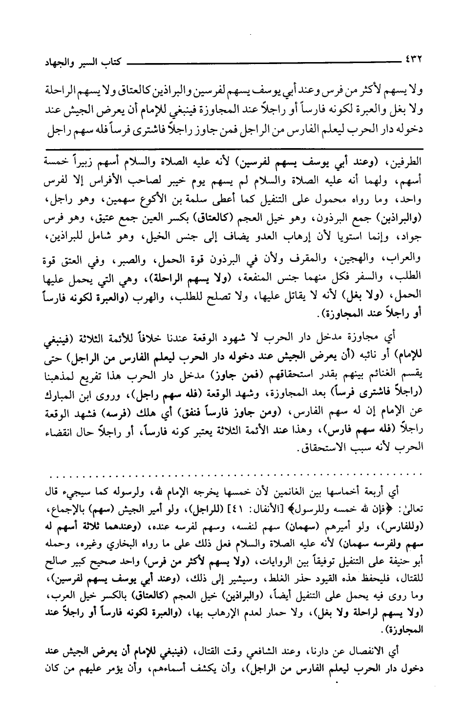ولا يسهم لراحلة وهي التي يحمل عليها الحمل ولا بغل لأنه لا يقاتل عليها ولا تصلح للطلب والهرب والعبرة لكونه فارسا أو راجلا عند المجاوزة أي مجاوزة مدخل دار الحرب لا شهود الوقعة عندنا خلافا للأئمة الثلاثة فينبغي للإمام أو نائبه أن يعرض الجيش عند دخوله دار الحرب ليعلم الفارس من الراجل حتى يقسم الغنائم بينهم بقدر استحقاقهم فمن جاوز مدخل دار الحرب هذا تفريع لمذهبنا راجلا فاشترى فرسا بعد المجاوزة وشهد الوقعة فله سهم راجل وروى ابن المبارك عن الإمام أن له سهم الفارس ومن جاوز فارسا فنفق أي هلك فرسه فشهد الوقعة راجلا فله سهم فارس وهذا عند الأئمة الثلاثة يعتبر كونه فارسا أو راجلا حال انقضاء الحرب لأنه سبب الاستحقاق