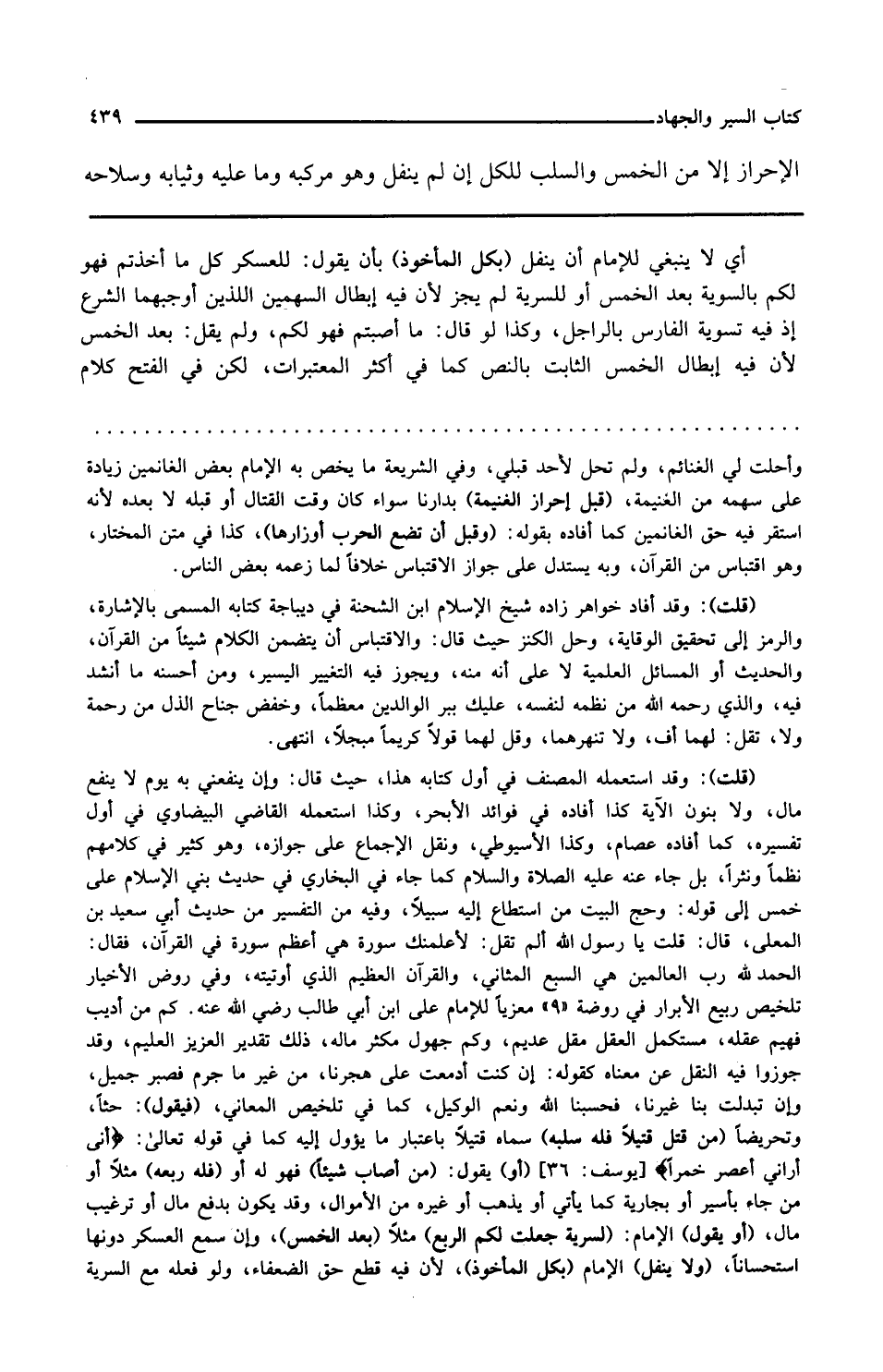 أي لا ينبغي للإمام أن ينفل بكل المأخوذ بأن يقول للعسكر كل ما أخذتم فهو لكم بالسوية بعد الخمس أو للسرية لم يجز لأن فيه إبطال السهمين اللذين أوجبهما الشرع إذ فيه تسوية الفارس بالراجل وكذا لو قال ما أصبتهم فهو لكم ولم يقل بعد الخمس لأن فيه إبطال الخمس الثابت بالنص كما في أكثر المعتبرات لكن في الفتح كلام
