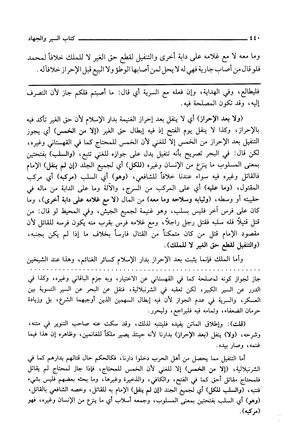 وفي الهداية وإن فعله مع السرية أي قال ما أصبتم فلكم جاز لأن التصرف إليه وقد تكون المصلحة فيه ولا بعد الإحراز أي لا ينفل بعد إحراز الغنيمة بدار الإسلام لأن حق الغير تأكد فيه بالإحراز وكذا لا ينفل يوم الفتح إذ فيه إبطال حق الغير إلا من الخمس أي يجوز التنفيل بعد الإحراز من الخمس إلا للغني لأن الخمس للمحتاج كما في القهستاني وغيره لكن قال في البحر تصريح بأنه تنفيل يدل على جوازه للغني تتبع والسلب بفتحتين بمعنى المسلوب ما ينزع من الإنسان وغيره للكل أي لجميع الجند إن لم ينفل الإمام فالقاتل وغيره فيه سواء عندنا خلافا للشافعي وهو أي السلب مركبه أي مركب المقتول وما عليه أي على المركب من السرج والآلة وما على الدابة من ماله في حقيبته أو وسطه وثيابه وسلاحه وما معه من المال لا مع غلامه على دابة أخرى وما كان على فرس آخر فليس بسلب وهو غنيمة لجميع الجيش